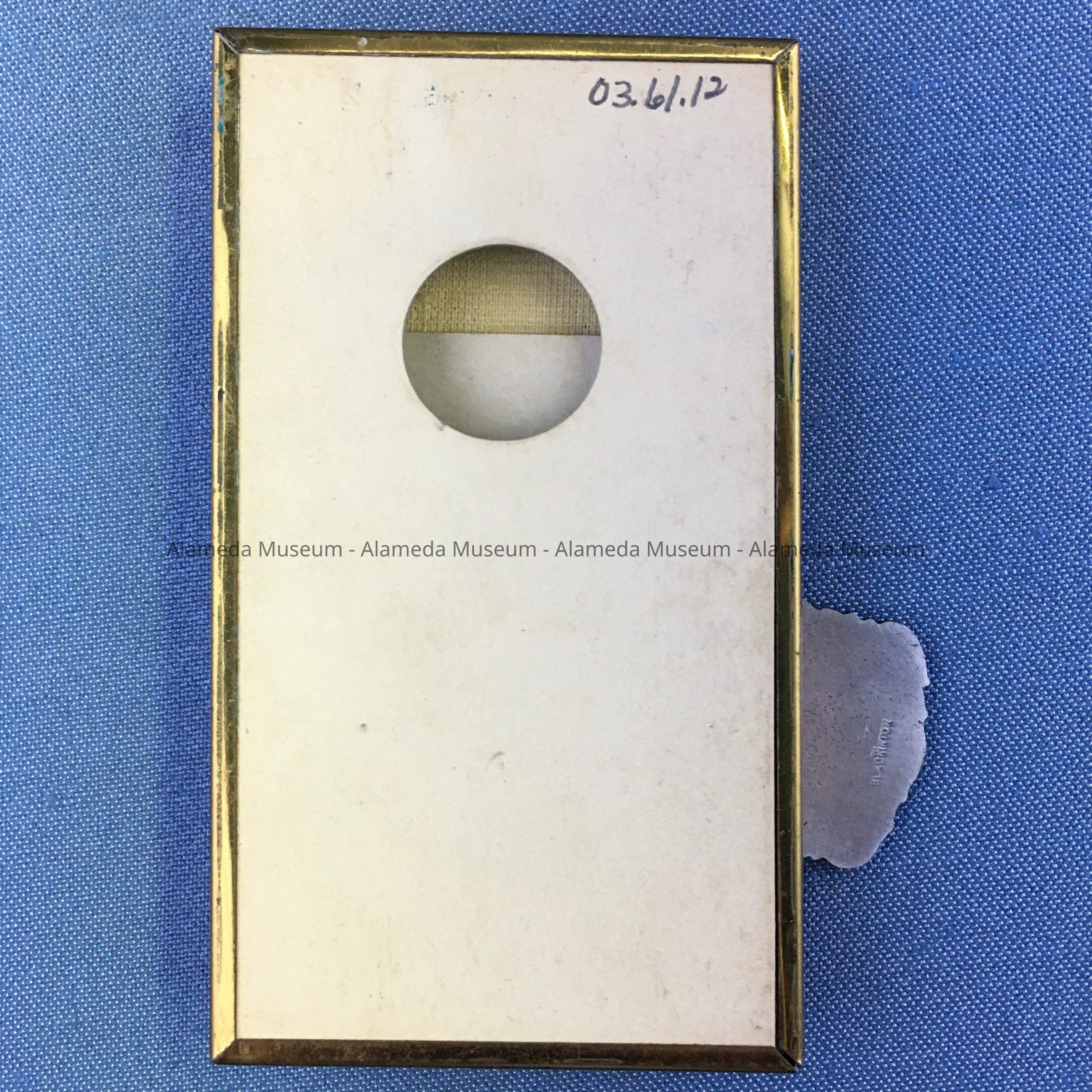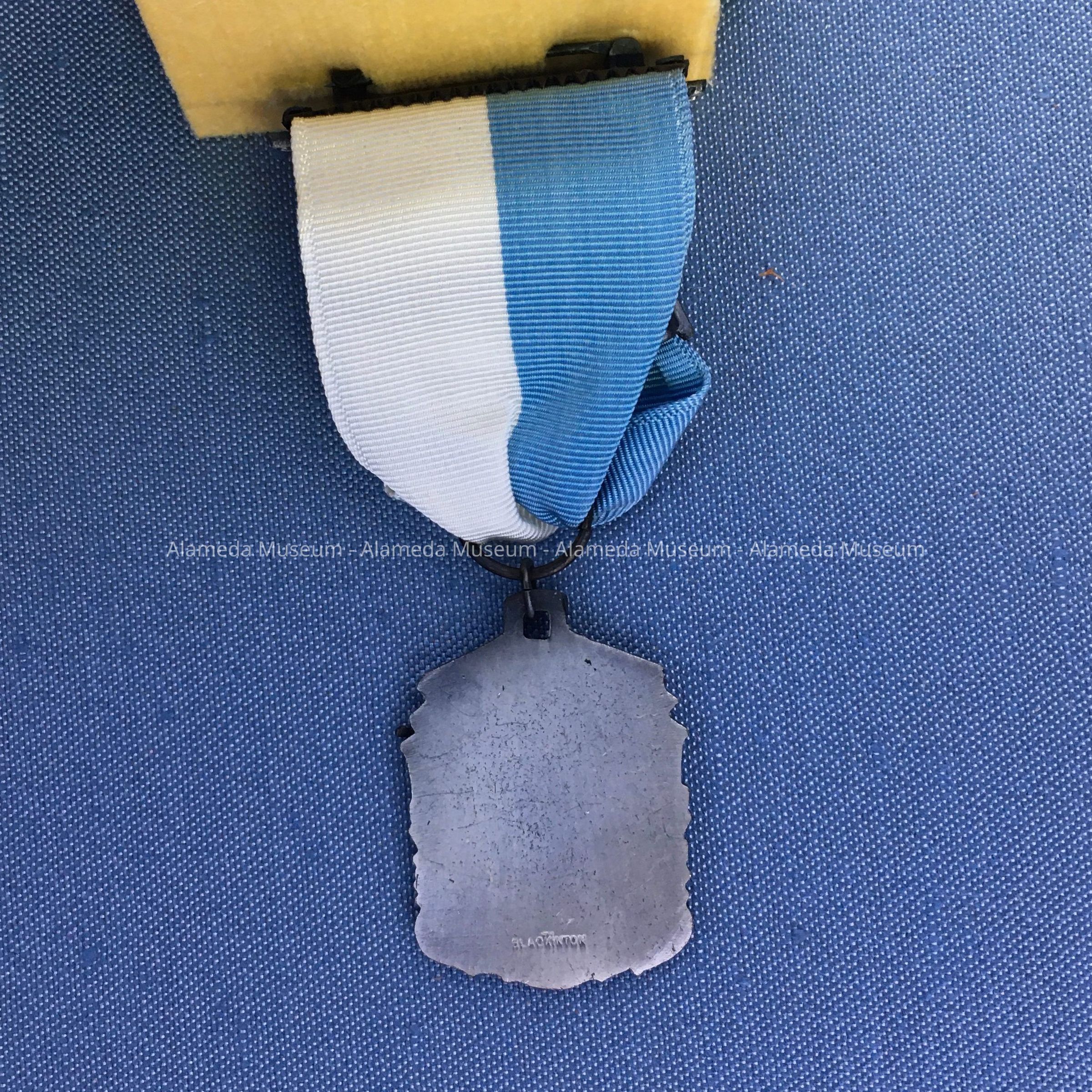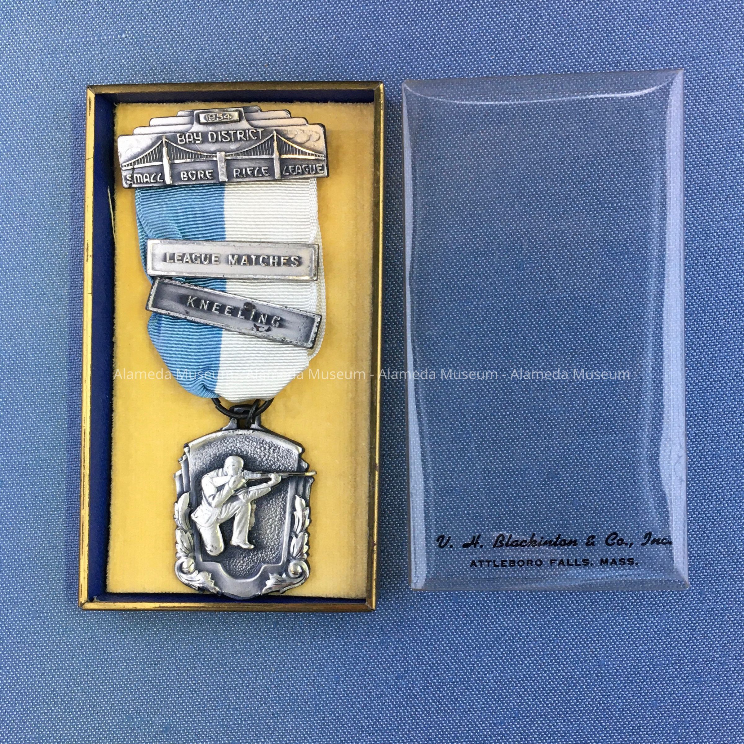 DESCRIPTION: SUPPORTING BAR OF MEDAL READS, "BAY DISTRICT SMALL BORE RIFLE LEAGUE," AND TWO ADDITIONAL BARS, "LEAGUE MATCHES AND KNEELING." THEY ARE ATTACHED TO A BLUE AND WHITE COLORED GROSGRAIN RIBBON. PENDANT HAS A MAN IN A KNEELING POSITION AND HOLDING A RIFLE. SILVER-PLATED MEDAL. YELLOW COLORED BACKGROUND.