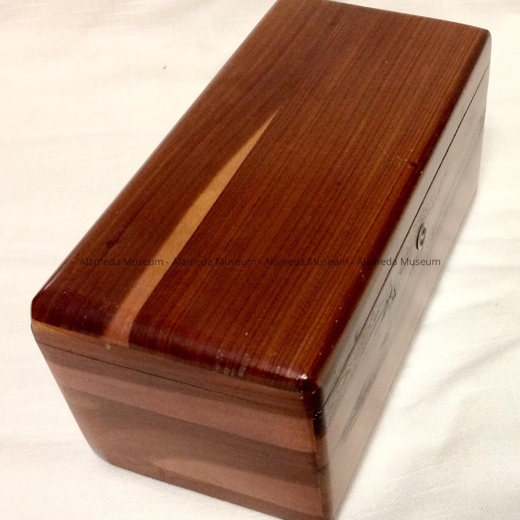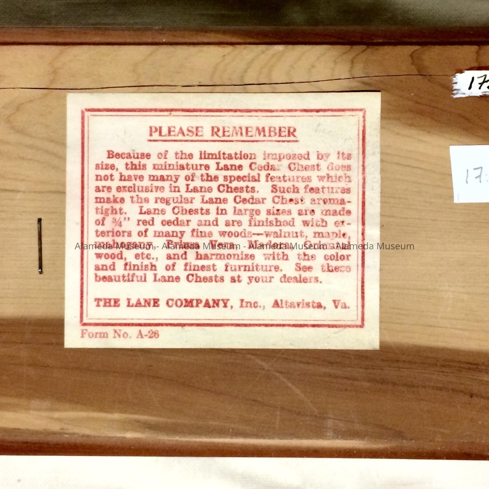 Description: A small chest-like box constructed of cedar with a varnished finish. The lid's interior has an embossed seal stating, "Lance Cedar Chests Altavista VA., Presented by Barker-Tilton, Alameda."