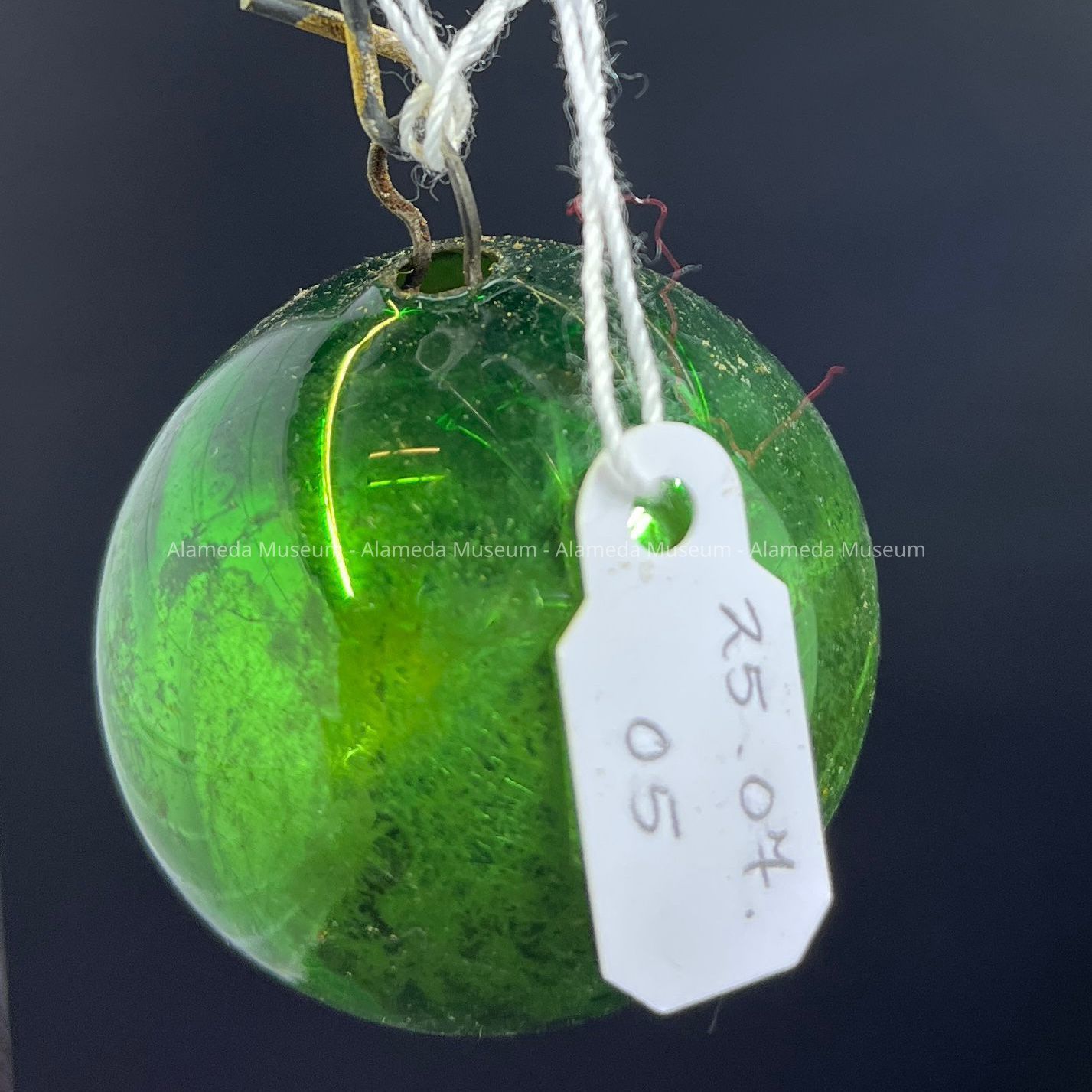 Description: Made with mercury inside, this ornament is green in color. With no top metal cap, it is held up with a wire from the inside.
