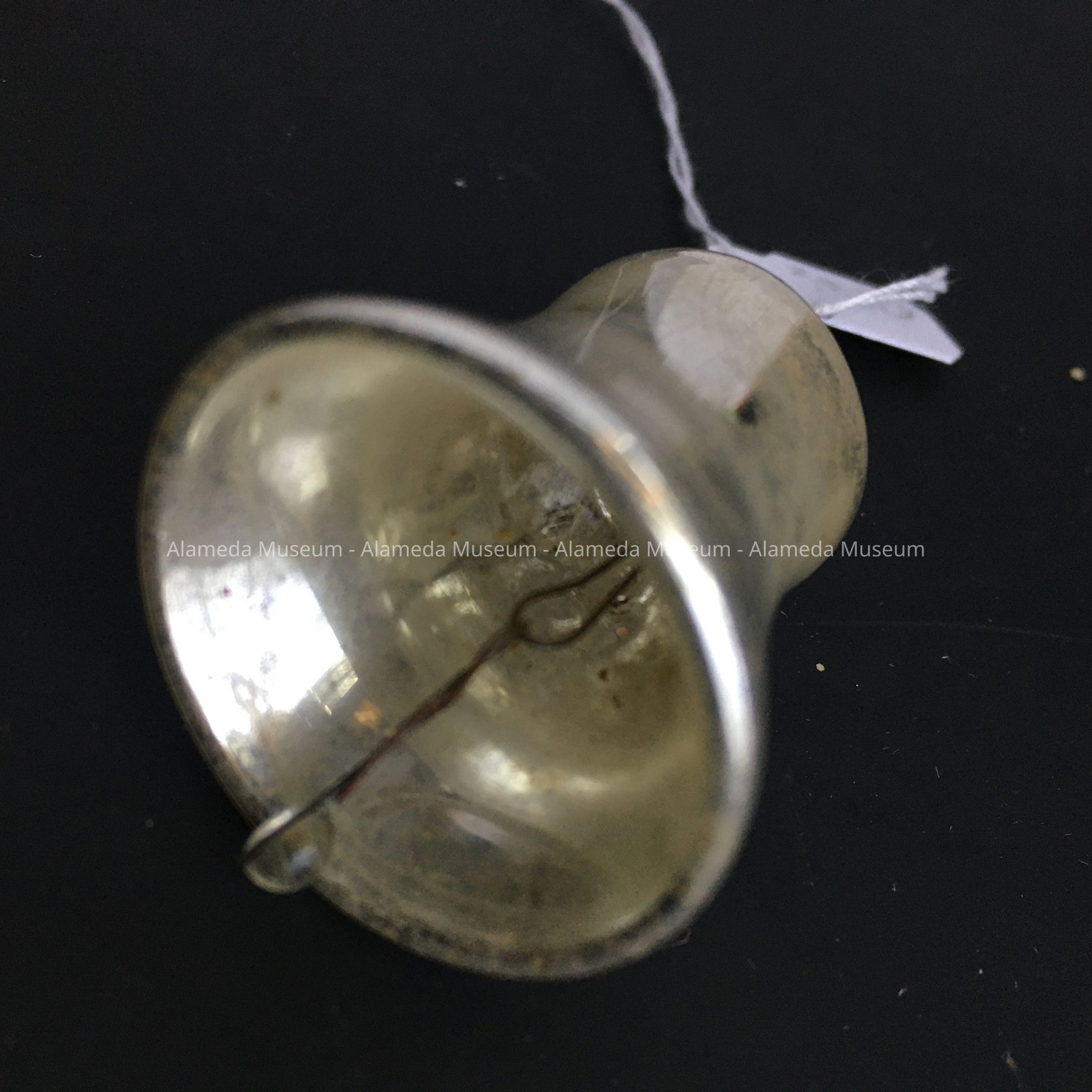 Description: A small silver ornament in the shape of a bell, with a glass bead attached to wires as clapper, making a clear tinkling sound when shaken.