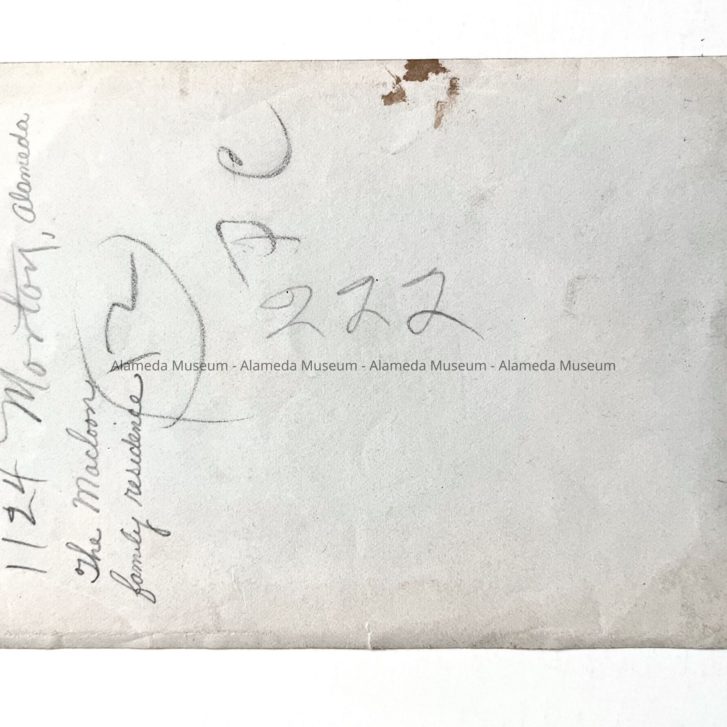 History of Object: Exterior photo of 1124 Morton Street, Alameda, taken during the occupancy of the Capt. C. H. Macloon family. It was erected in 1890 by A. W. Pattiani & Co., architects & builders, for Frederick Wild (plumbing & gasfitting, S.F.), and sold in 1897 to the Macloons who occupied it until 1984.