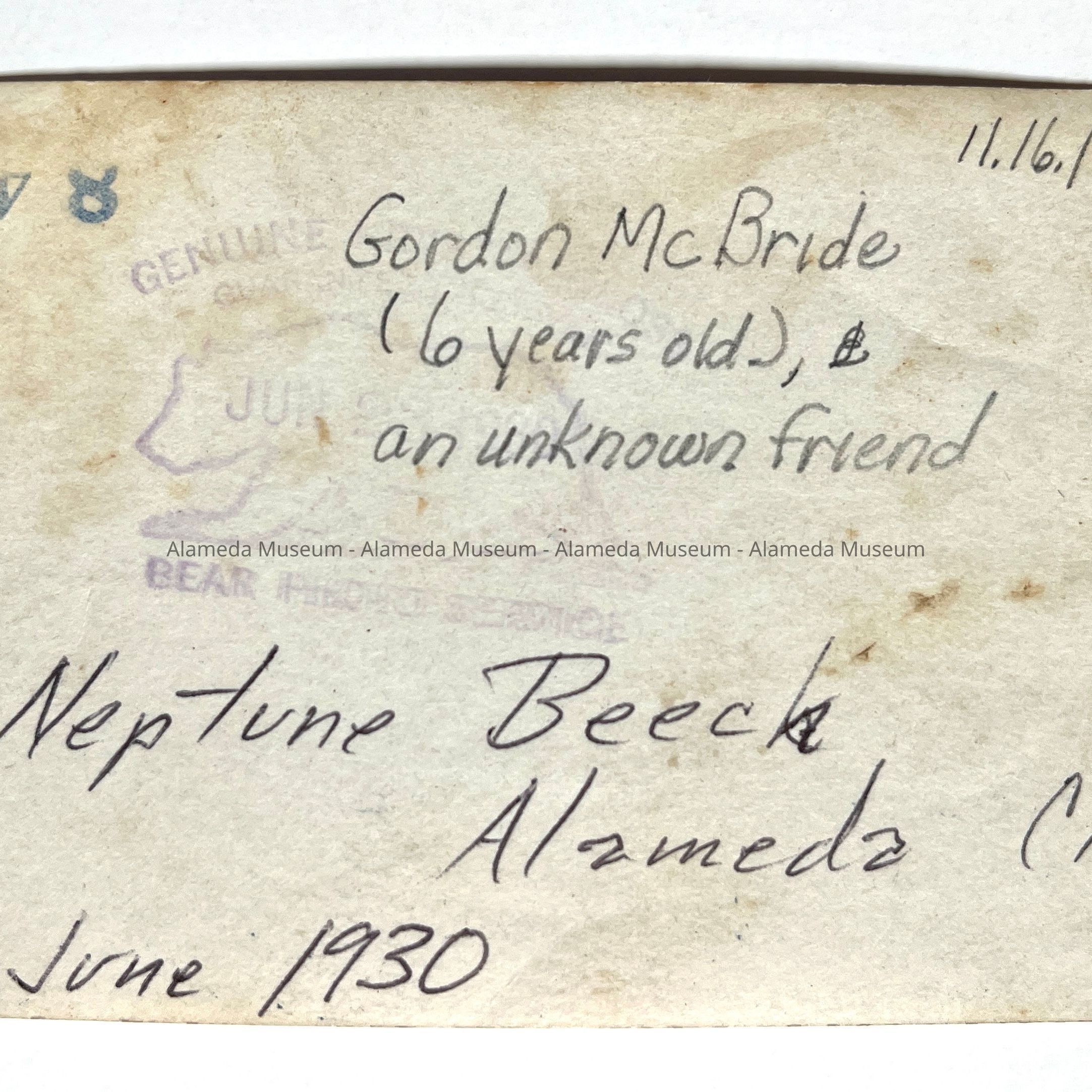 Snapshot photo of Gordon McBride and friend at Neptune Beach, 1930Entry/Object ID