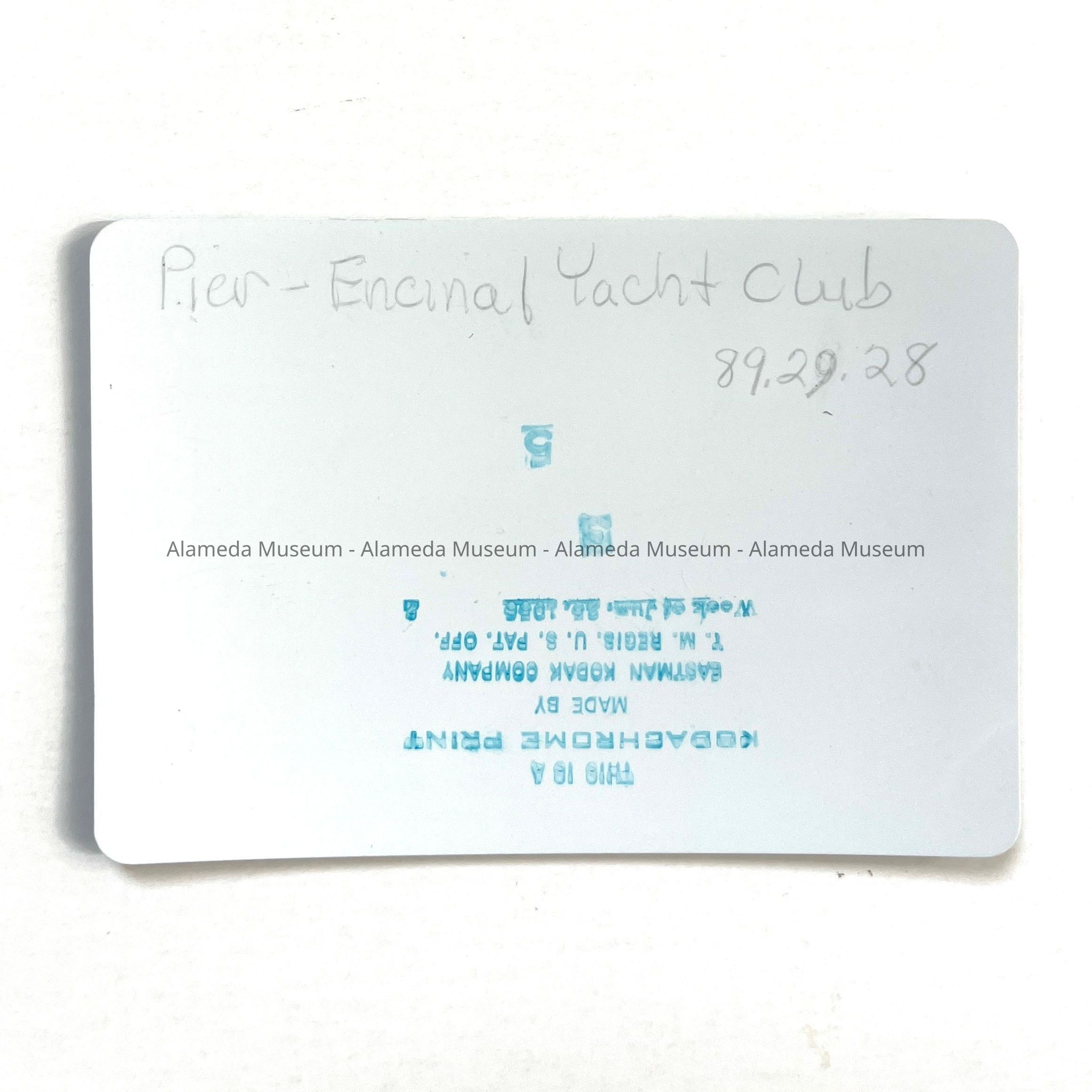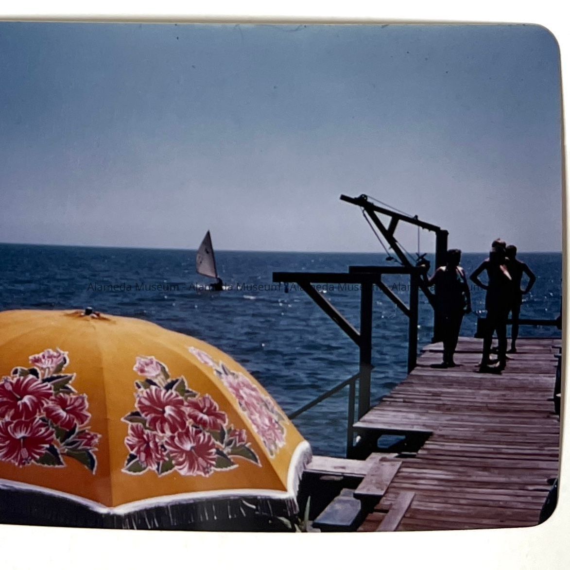 Colored photo showing pier at the foot of Grand Street, Alameda prior to South Shore fill.
