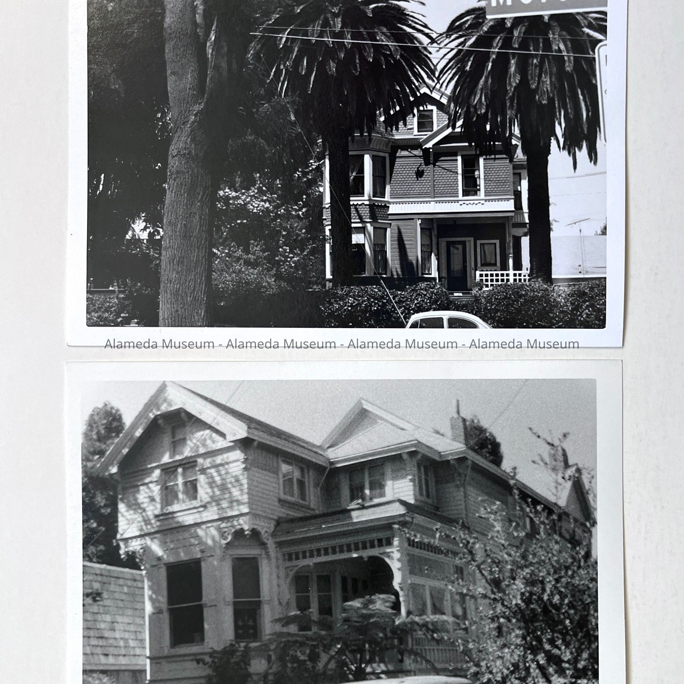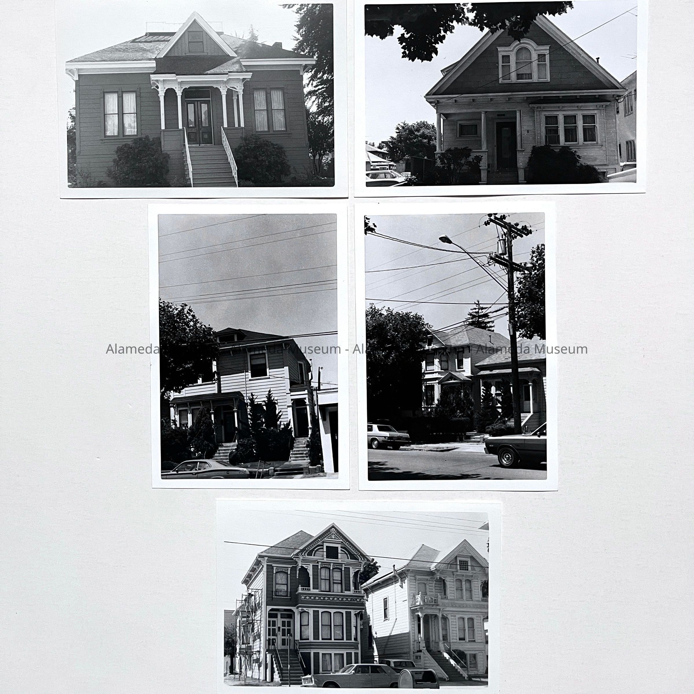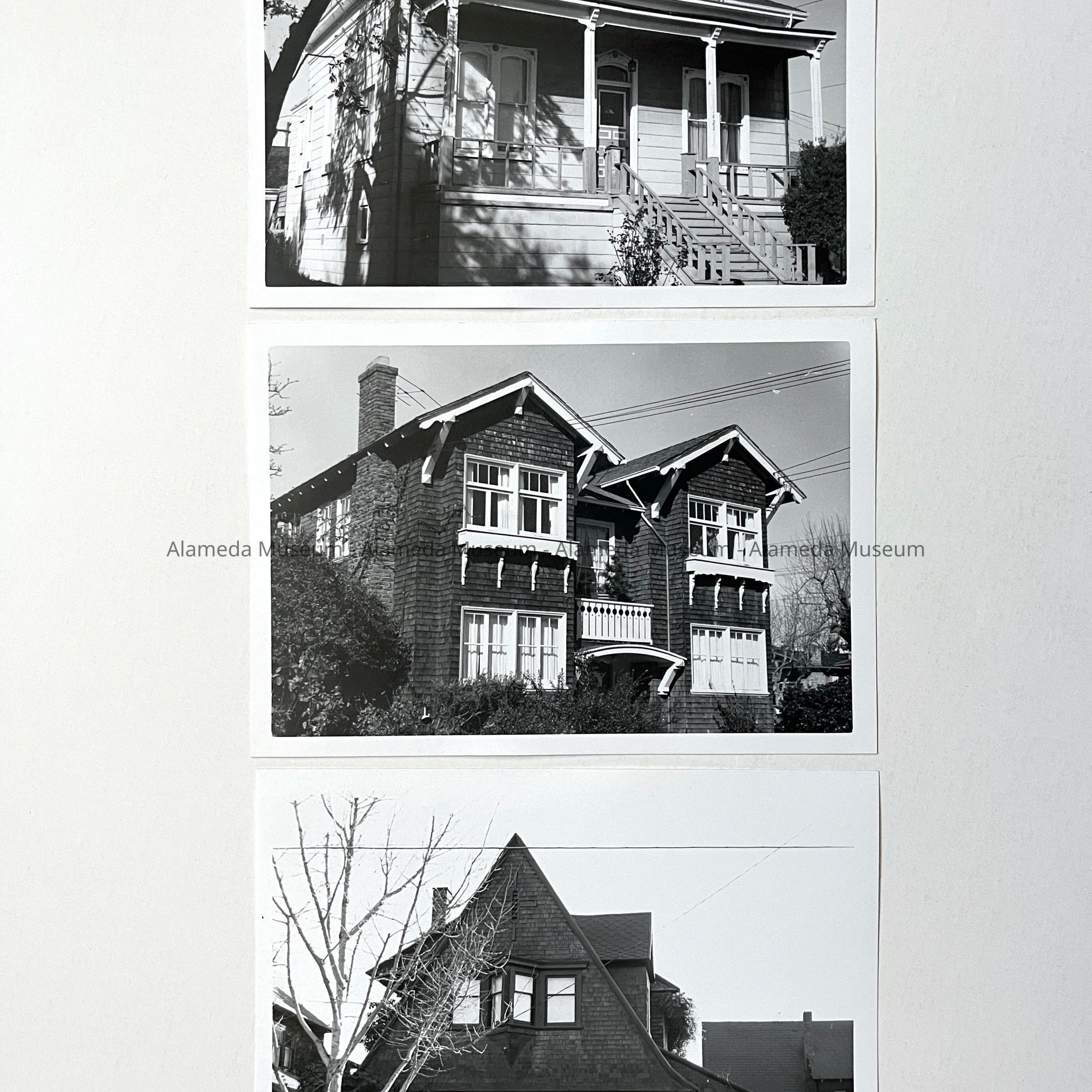 A SERIES OF PHOTOS THAT APPEAR TO HAVE BEEN TAKEN BY THE SAME PERSON OF BUILDINGS (MOSTLY VICTORIAN HOUSES) IN ALAMEDA.