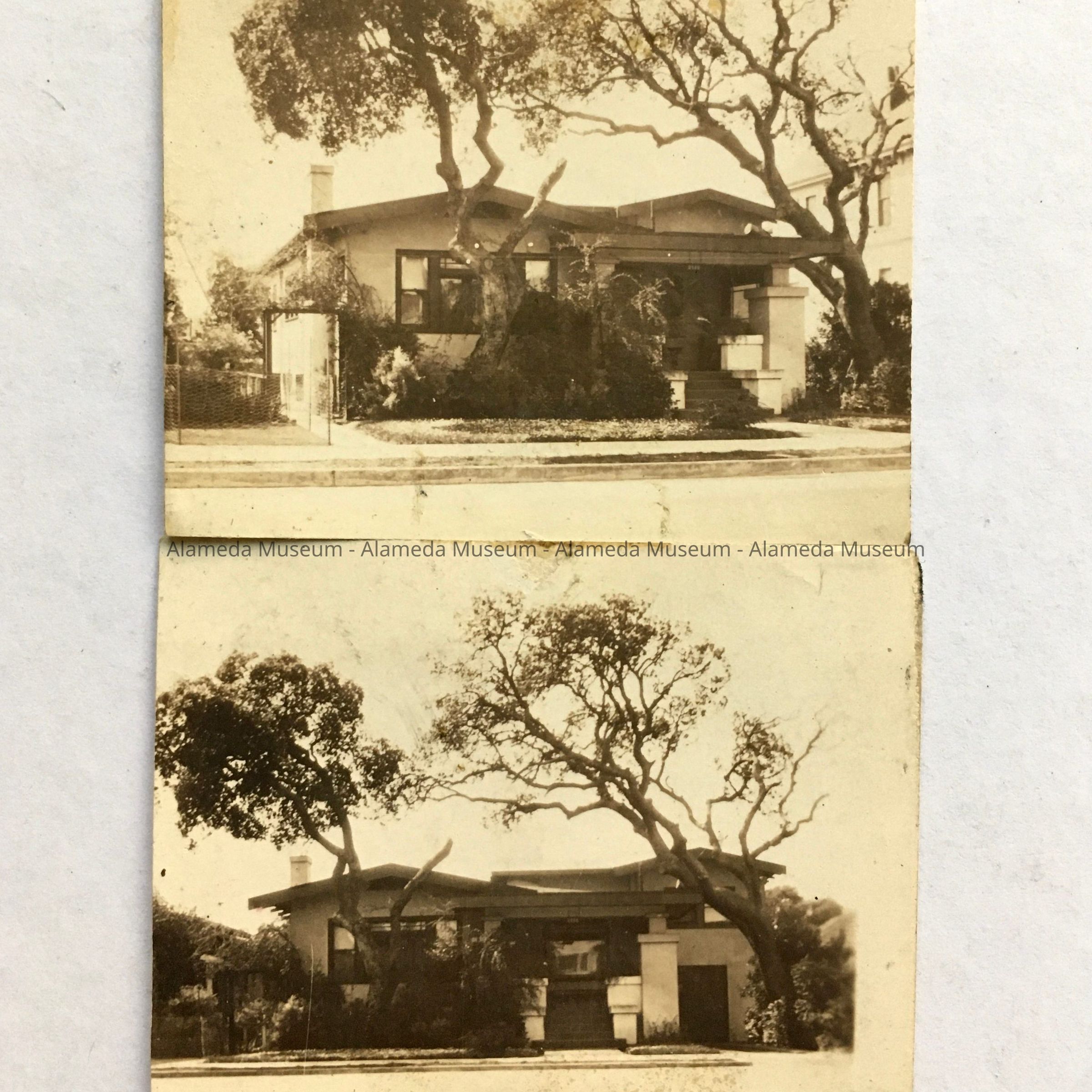 Description: Two small sepia-tinted photos, showing a house with two large trees in the front yard.