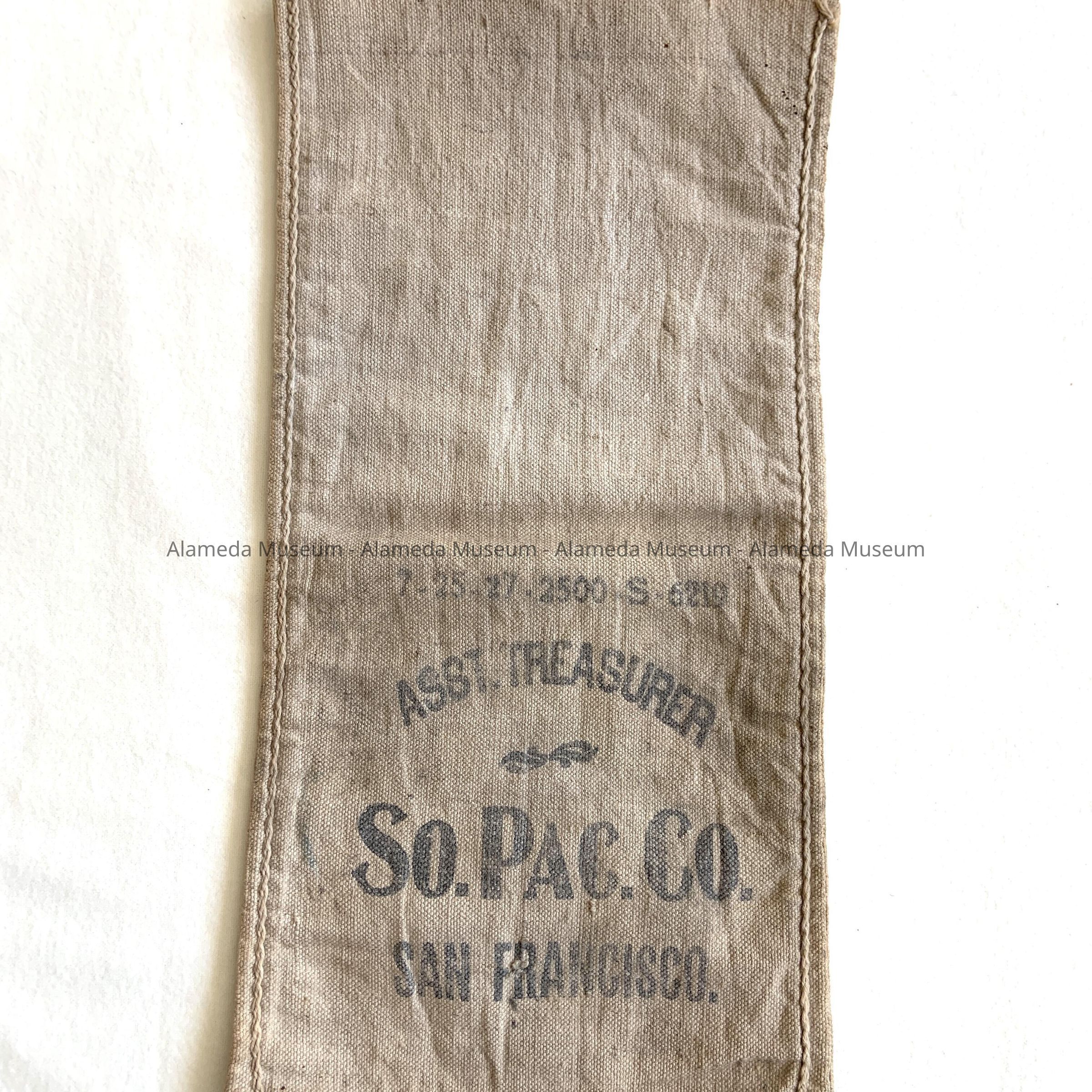 Description: Oblong canvas bag with printed inscription in black colored type "ASST. TREASURER-SO. PAC. CO., SAN FRANCISCO." Serial numbers 7-25-27-2500.5.6219.