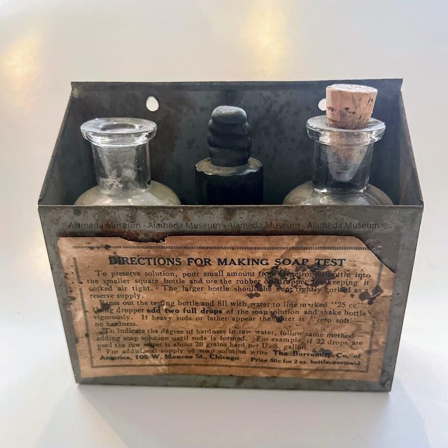 HISTORY OF OBJECT: SOAP TEST KIT USED TO FIND THE DEGREE OF HARDNESS IN WATER. IT WAS FOUND IN THE BASEMENT OF THE HENRY H. MEYERS' RESIDENCE.
