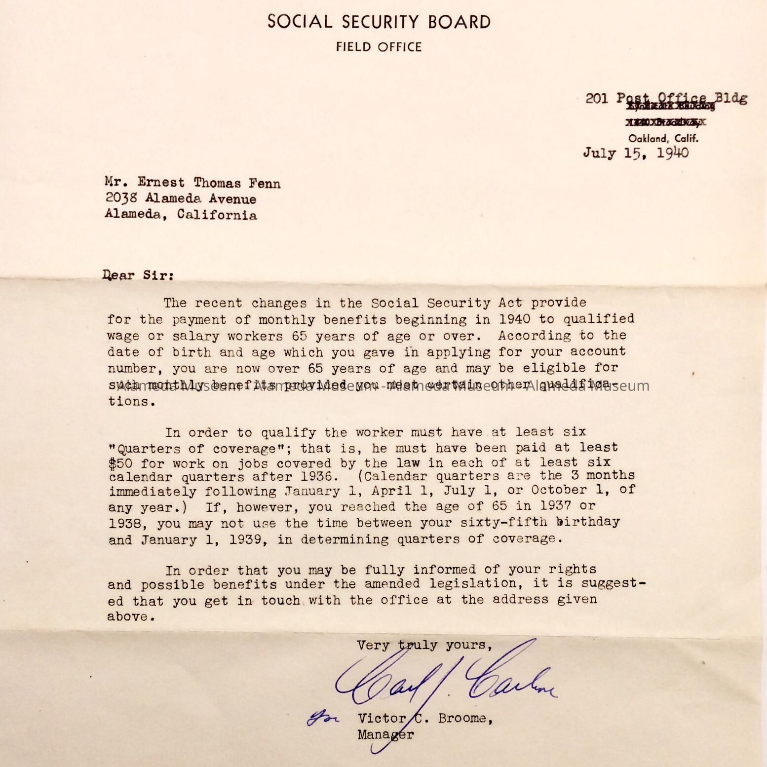 HISTORY OF OBJECT: A FORM LETTER ADDRESSED TO ERNEST THOMAS FENN OF 2038 ALAMEDA AVENUE CONCERNING HIS ELIGIBILITY FOR SOCIAL SECURITY. IN 1940, ERNEST FENN TURNED 65 YEARS OLD.