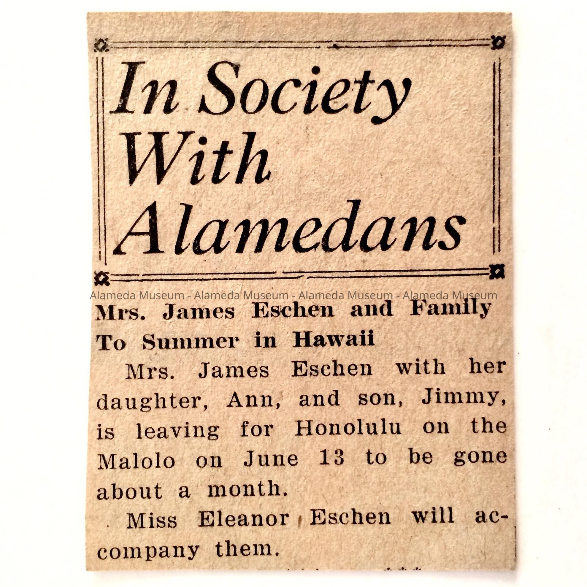 A NEWSPAPER CLIPPING FROM THE SOCIETY SECTION, REPORTING ON A SUMMER TRIP TO HAWAII, TO BE MADE BY MRS JAMES ESCHEN AND FAMILY, WHO RESIDED AT 1303 CAROLINE STREET, ALAMEDA.