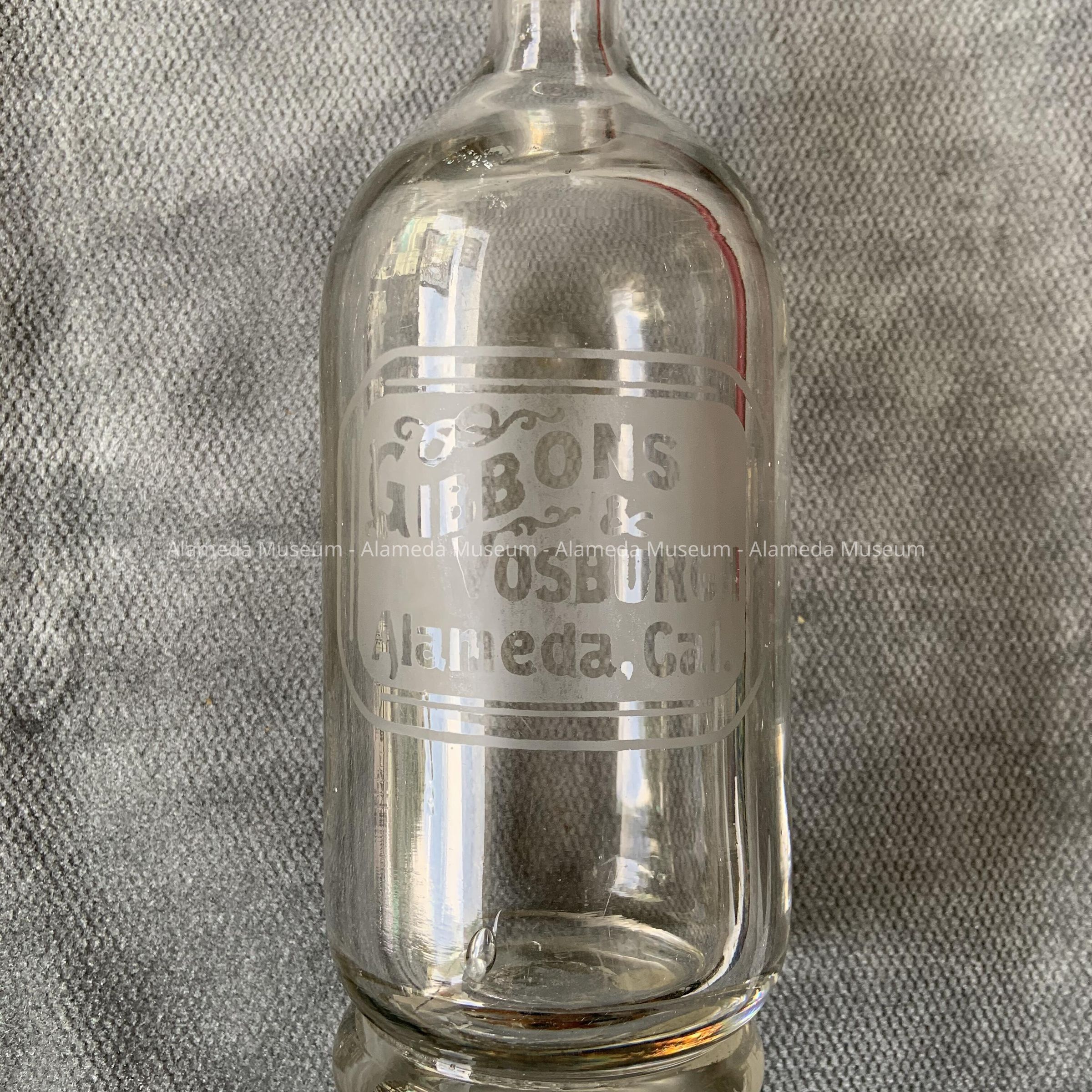 Description: A clear glass blown in a mold glass bottle. Its base has unpolished punty (aka "puntil") work. The bottle has a self-label, frosted, stating: "Gibbons & Vosburgh Alameda, Cal." The bottle has an indentation of a protruding self-rim. The base extends to the top of the bottle that has a protruding spout for a cork stopper.