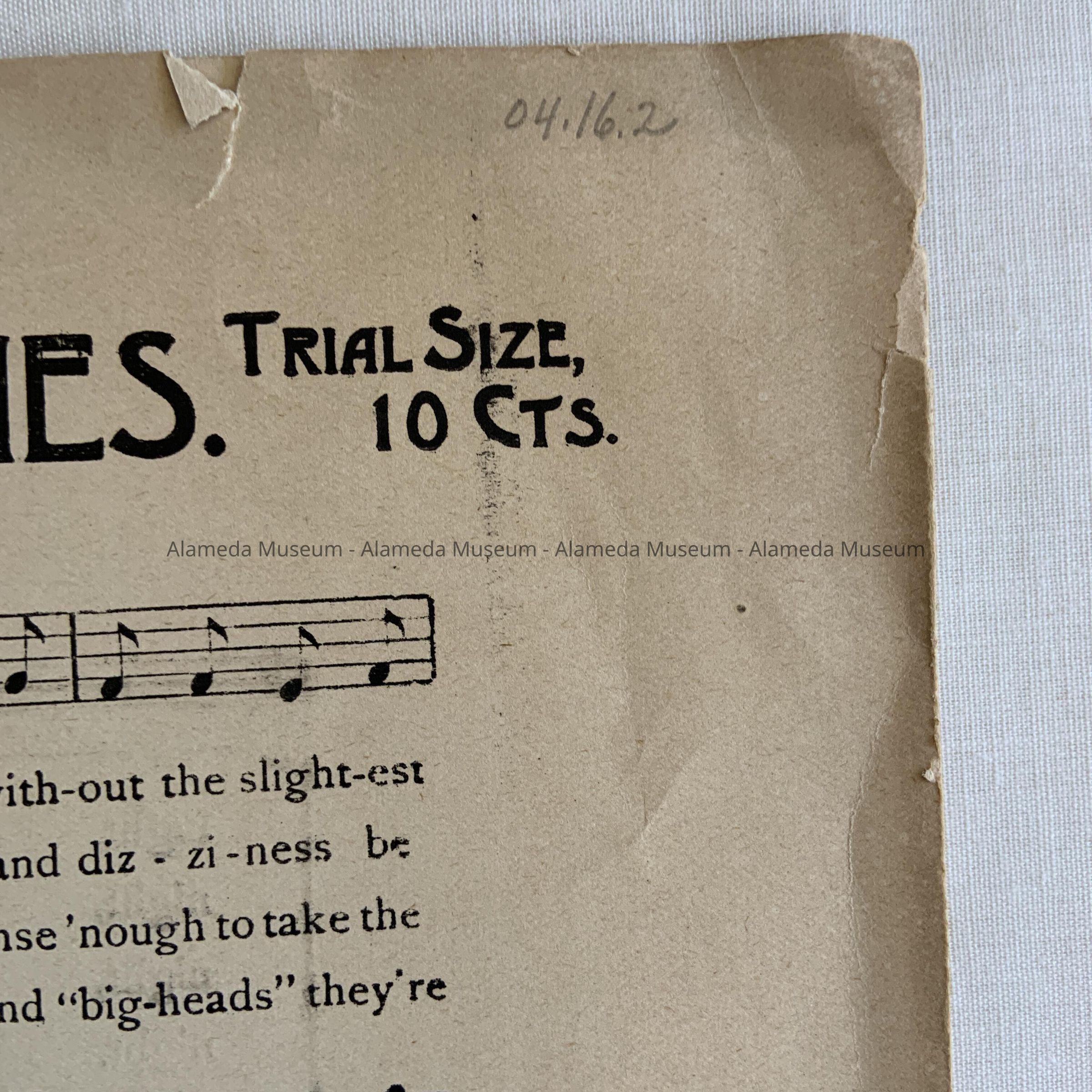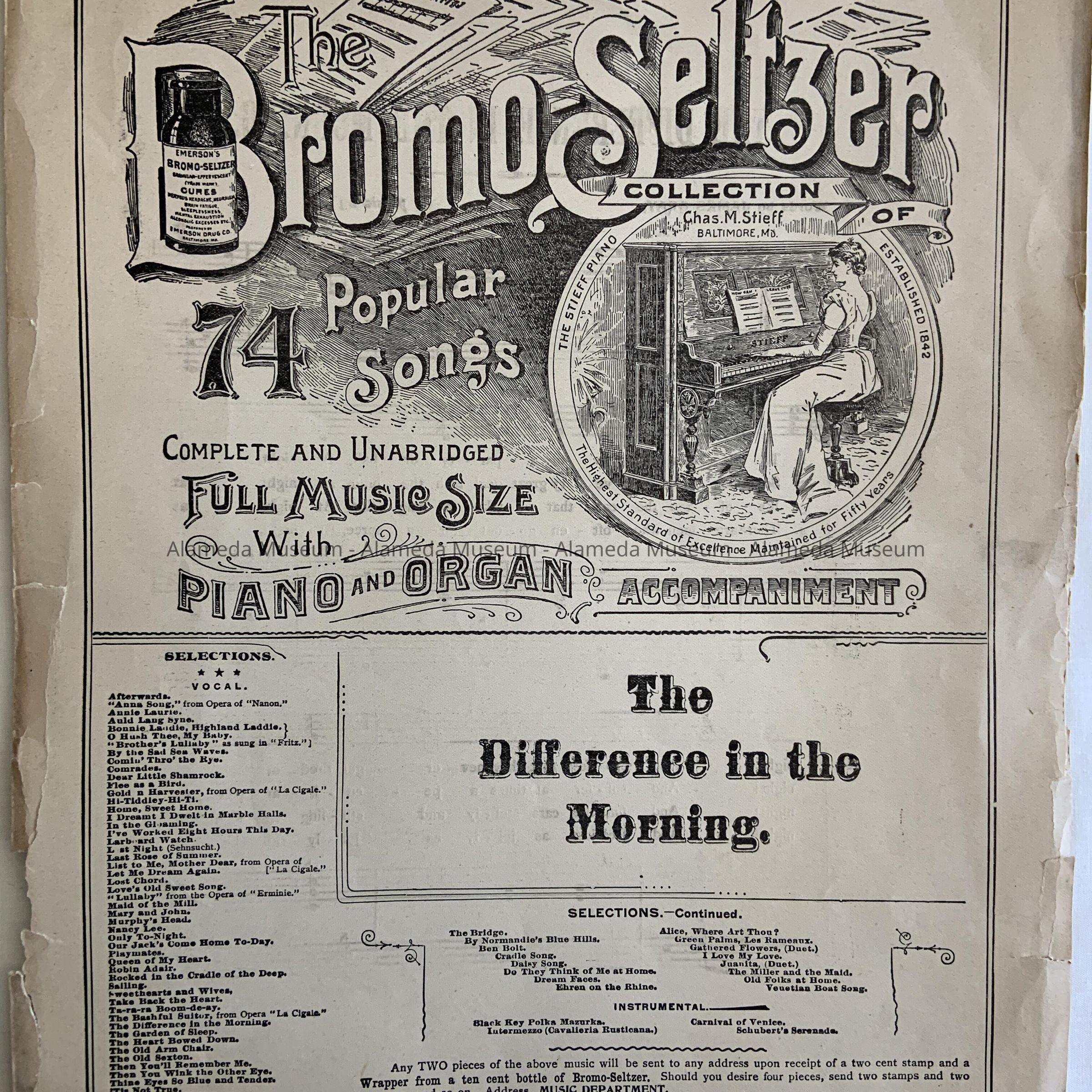 Song book advertizing Bromo Seltzer, from Encinal Pharmacy, c. 1900Entry/Object ID