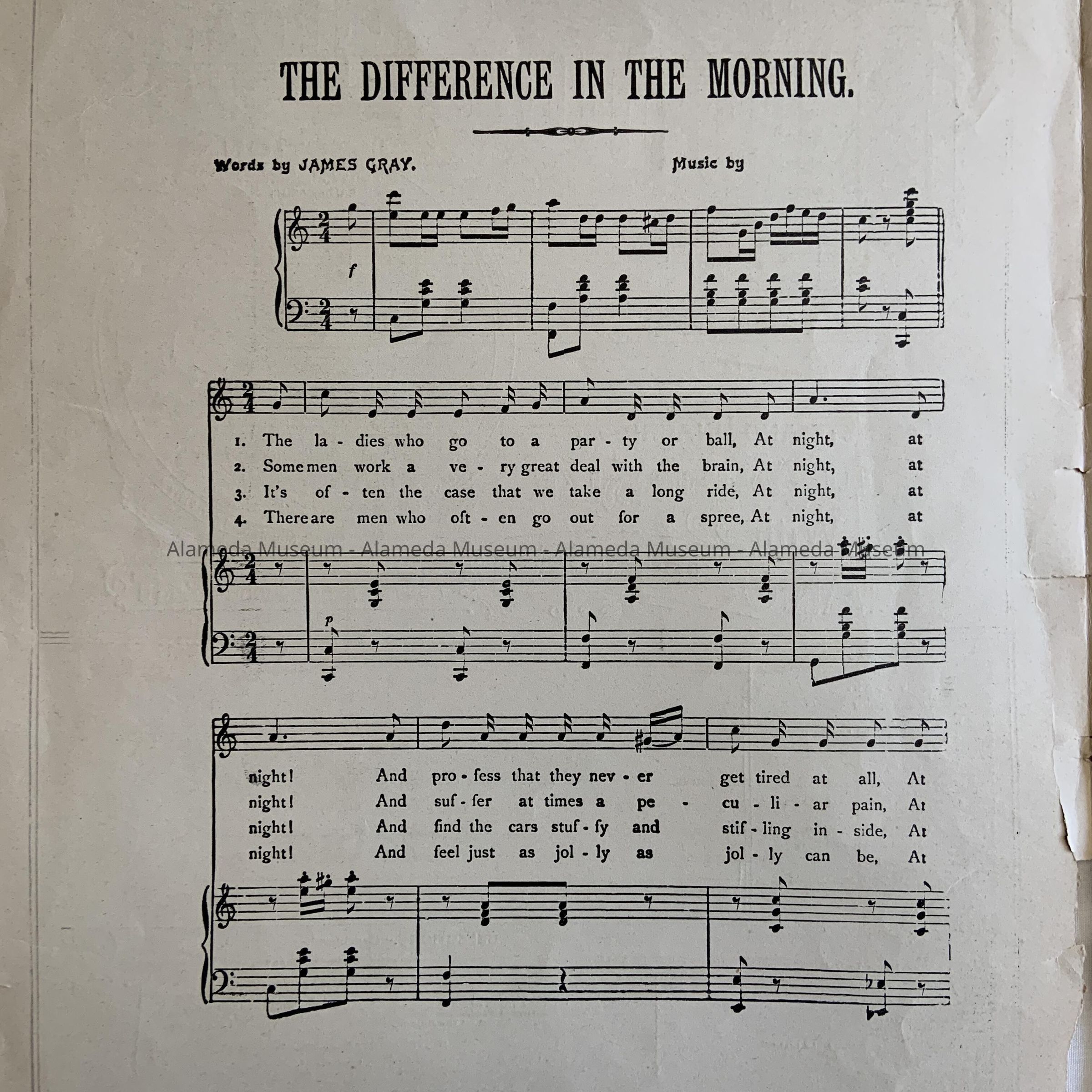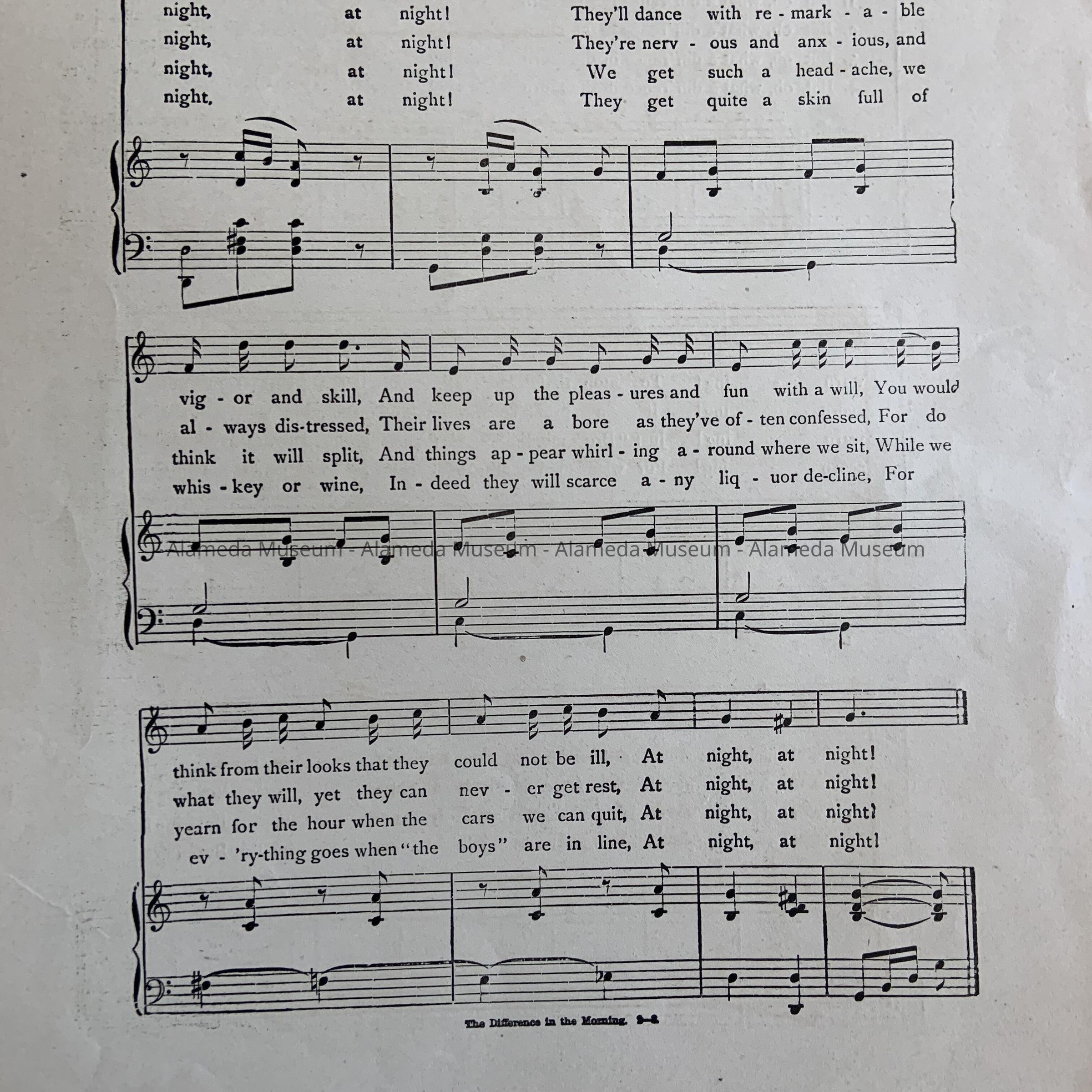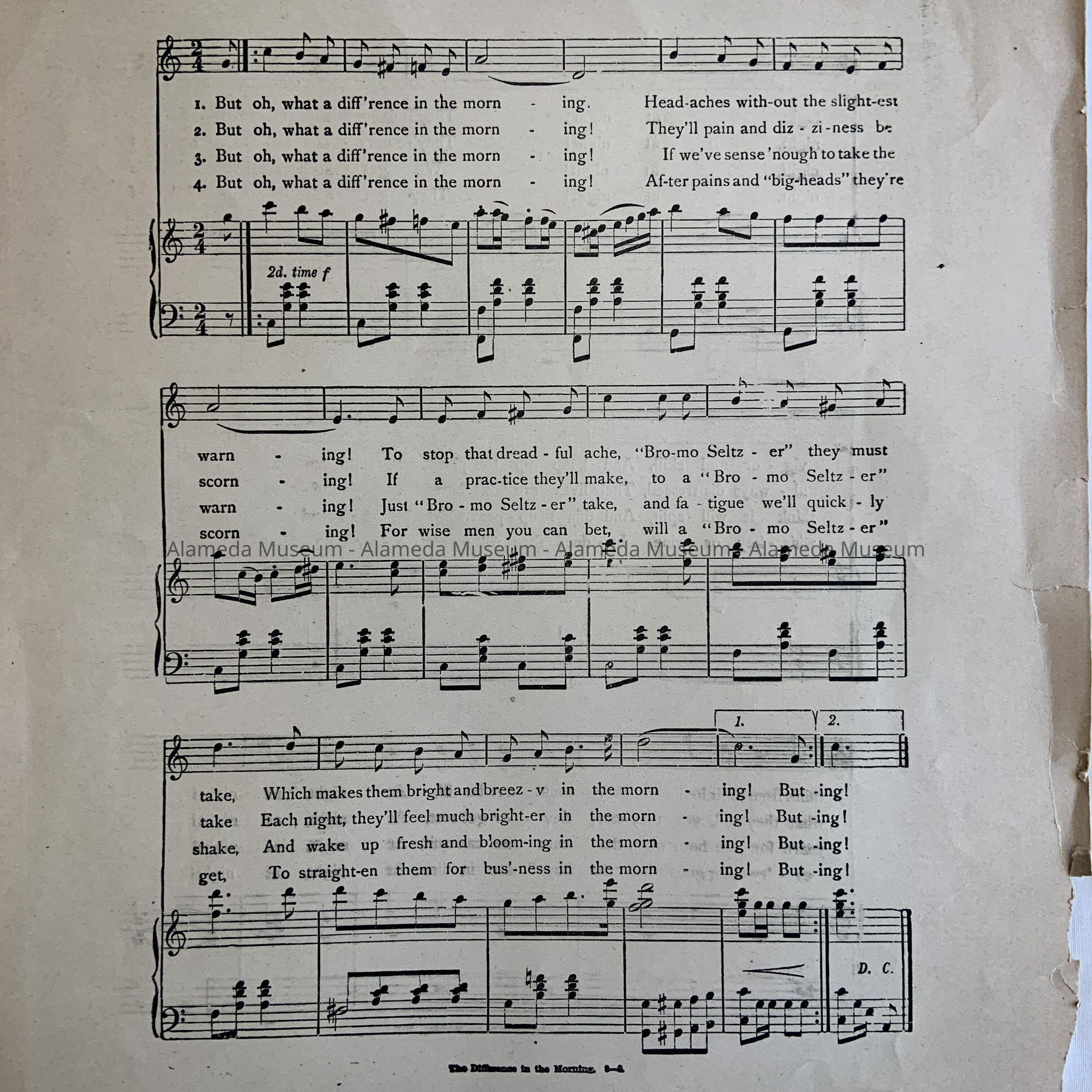 SHEET MUSIC, CONSISTING OF AN ILLUSTRATED COVER. BOLD-PRINTED CAPTION READS, "THE BROMO SELTZER COLLECTION OF 54 POPULAR SONGS," IN BLACK-COLORED TYPE ON AN OFF-WHITE-COLORED BACKGROUND. SONG TITLE, "THE DIFFERENCE IN THE MORNING."