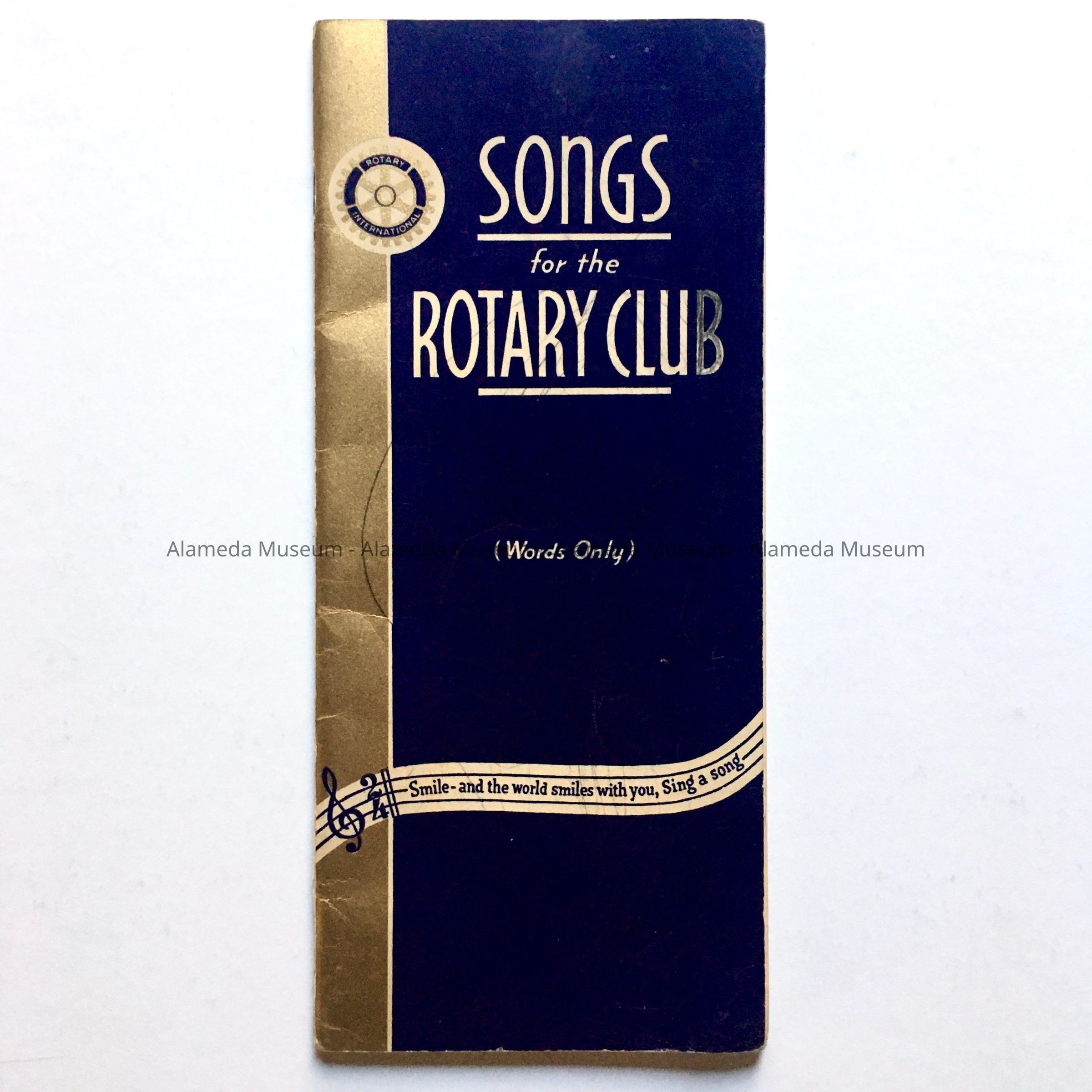 Description: 86-page Booklet, with card stock cover printed in gold and blue with white type, titled: Songs for the Rotary Club (Words Only'). Inside has lyrics, frequently with copyright specified. First page has a name and address.