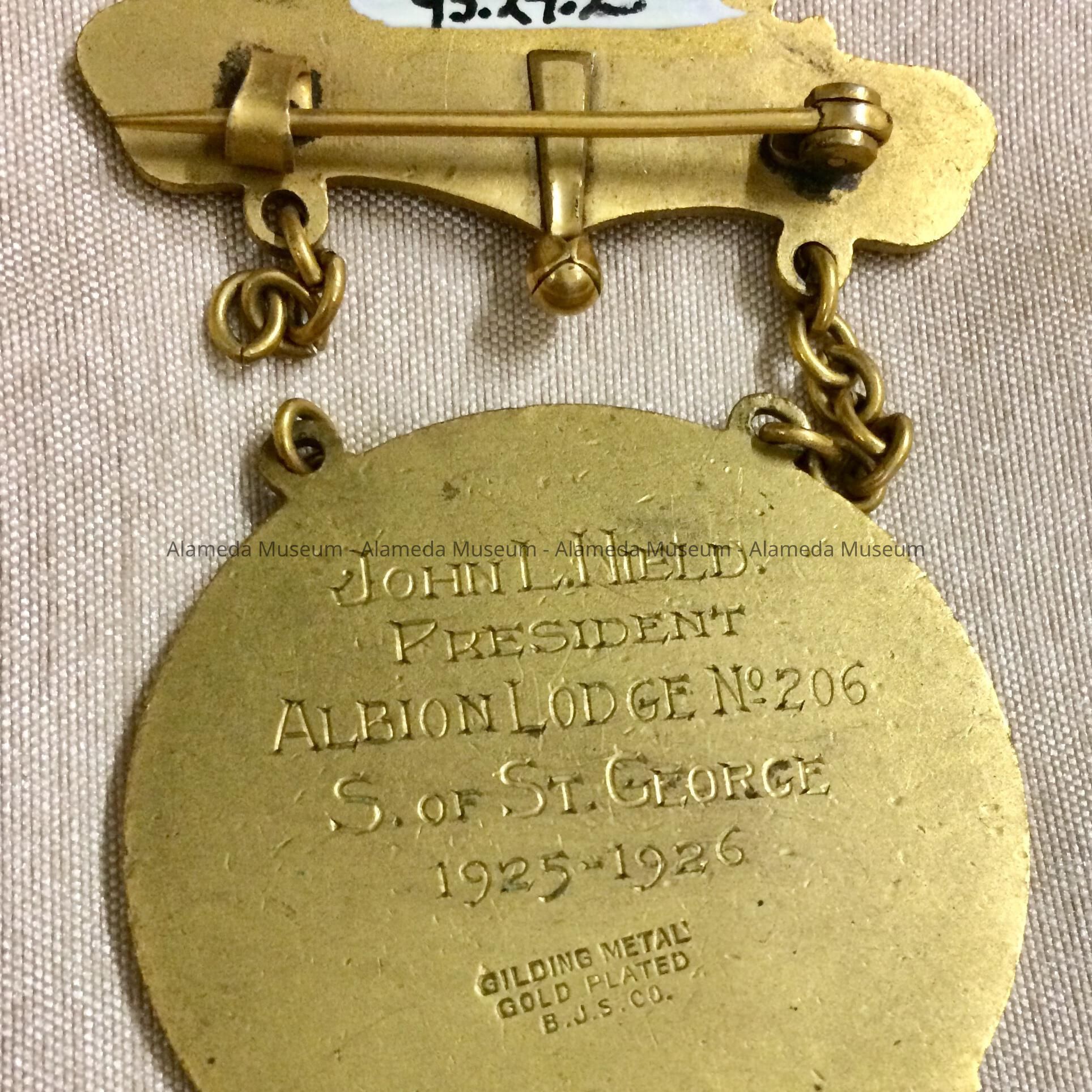 Medal presented to John L. Nield by the Sons of St. George, a fraternal lodge composed of men of English extraction. Mr. Nield was a longtime resident of Alameda and the Grandfather of the donor.