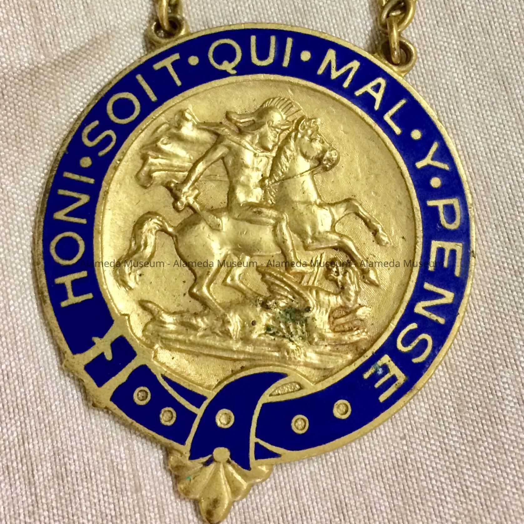 Circular shaped, gold plated metal, with banding in cobalt blue colored enameling. Center motif of St. George slaying dragon. Medallion is supported by bar pin with chains. On reverse side is engraved John L. Nield, President Albion Lodge #206 Son of St. George 1925-1926.