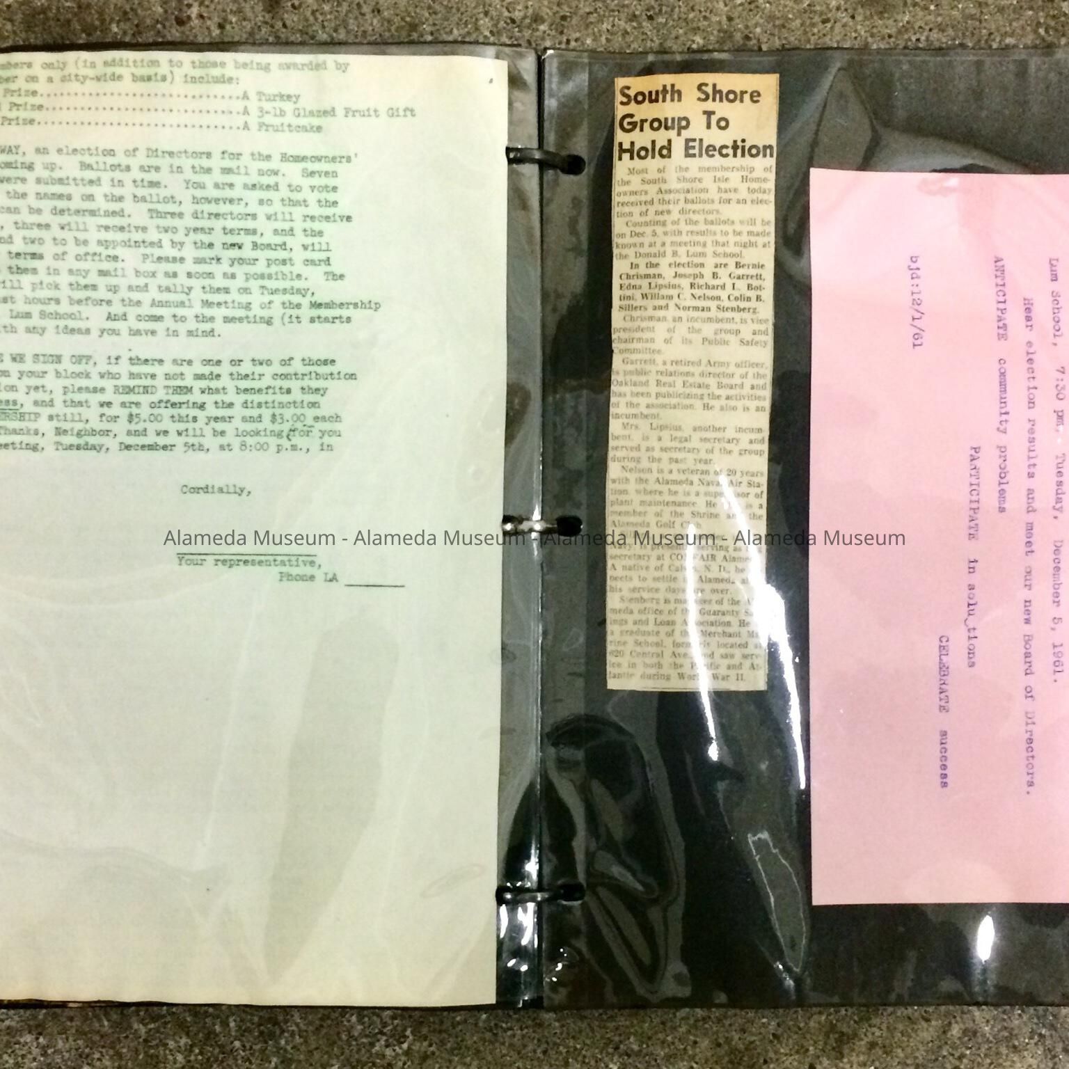 History of Object: Scrapbook containing articles, etc. about the founding & activities of the South Shore Homeowners Association. Elected to the first Board of Directors of the association (1961) was the donor, B. L. Chrisman. He later served as president in 1962.