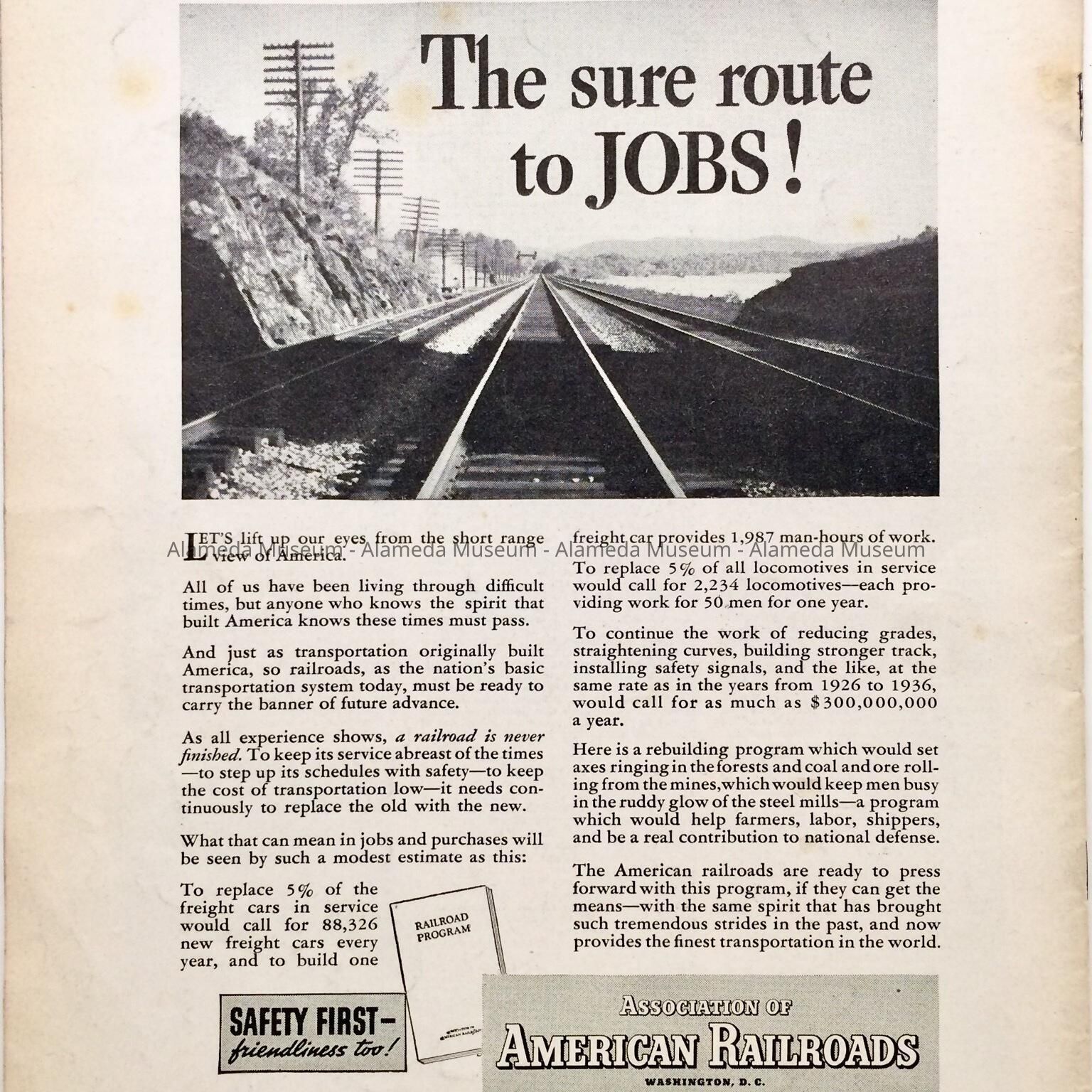 Softbound edition of the “Southern Pacific Bulletin” of 1939. Page 6 contains illustrations with black-and-white photograph of the mock burial at sea of the model Southern Pacific ferry now on display at the Alameda Historical Museum. Given to the Alameda Historical Society prior to 1971, numbered 110, but never catalogued.