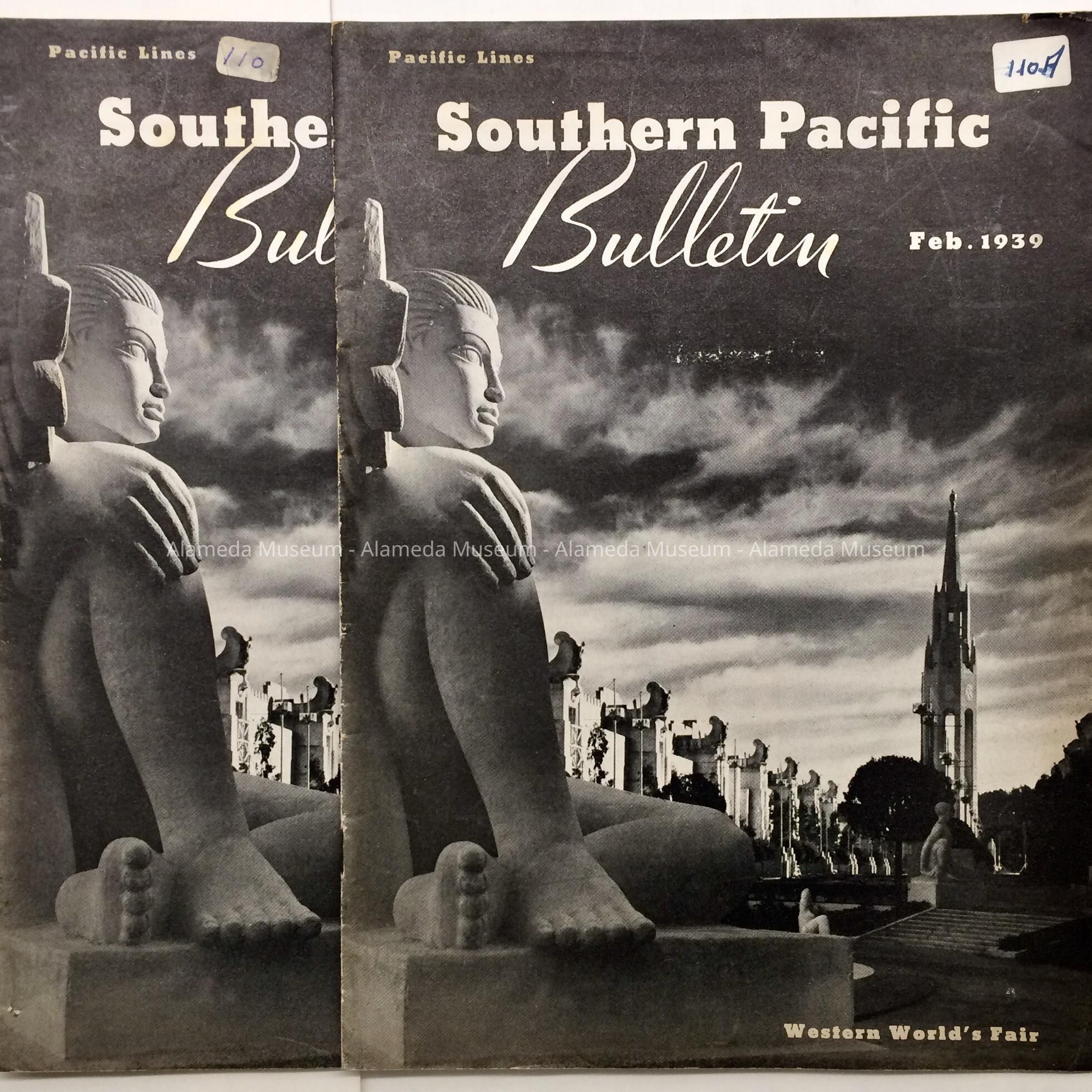 3 copies of softbound magazine with photolithographic illustration of the 1939 World's Fair and bold-printed caption, “Southern Pacific Bulletin”.
