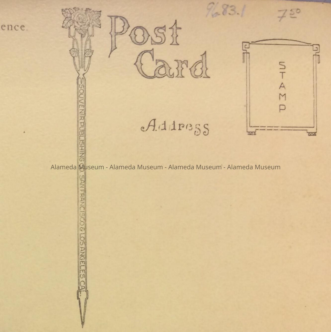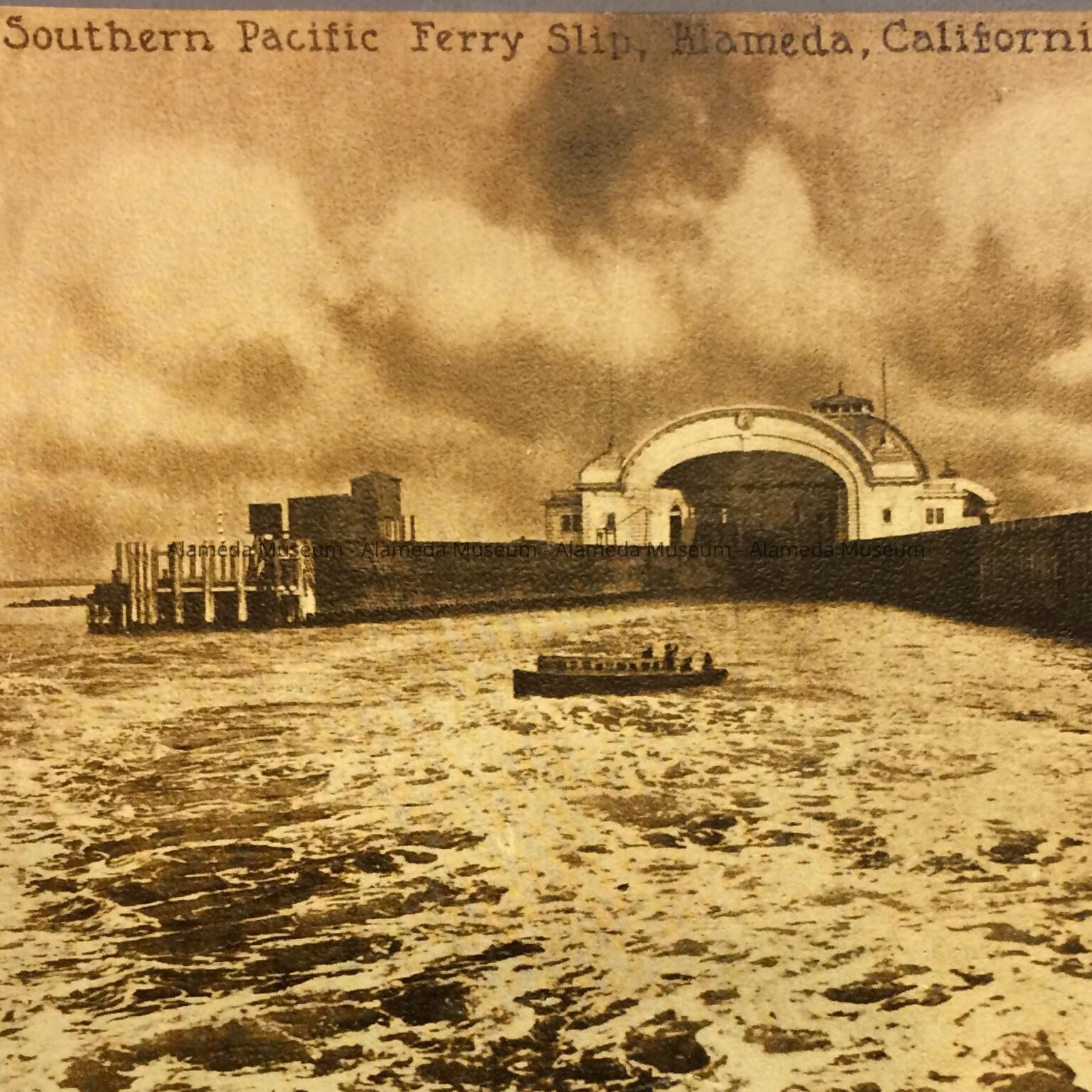 SEPIA TINTED PHOTOLITHOGRAPHIC POST CARD, WITH CAPTION, "SOUTHERN PACIFIC FERRY SLIP, ALAMEDA, CALIFORNIA." REVERSE SIDE IS SIGNED, "SOUVENIR PUBLISHING COMPANY, SAN FRANCISCO AND LOS ANGELES, CALIFORNIA." L 3-1/2" X W 5-1/4"
