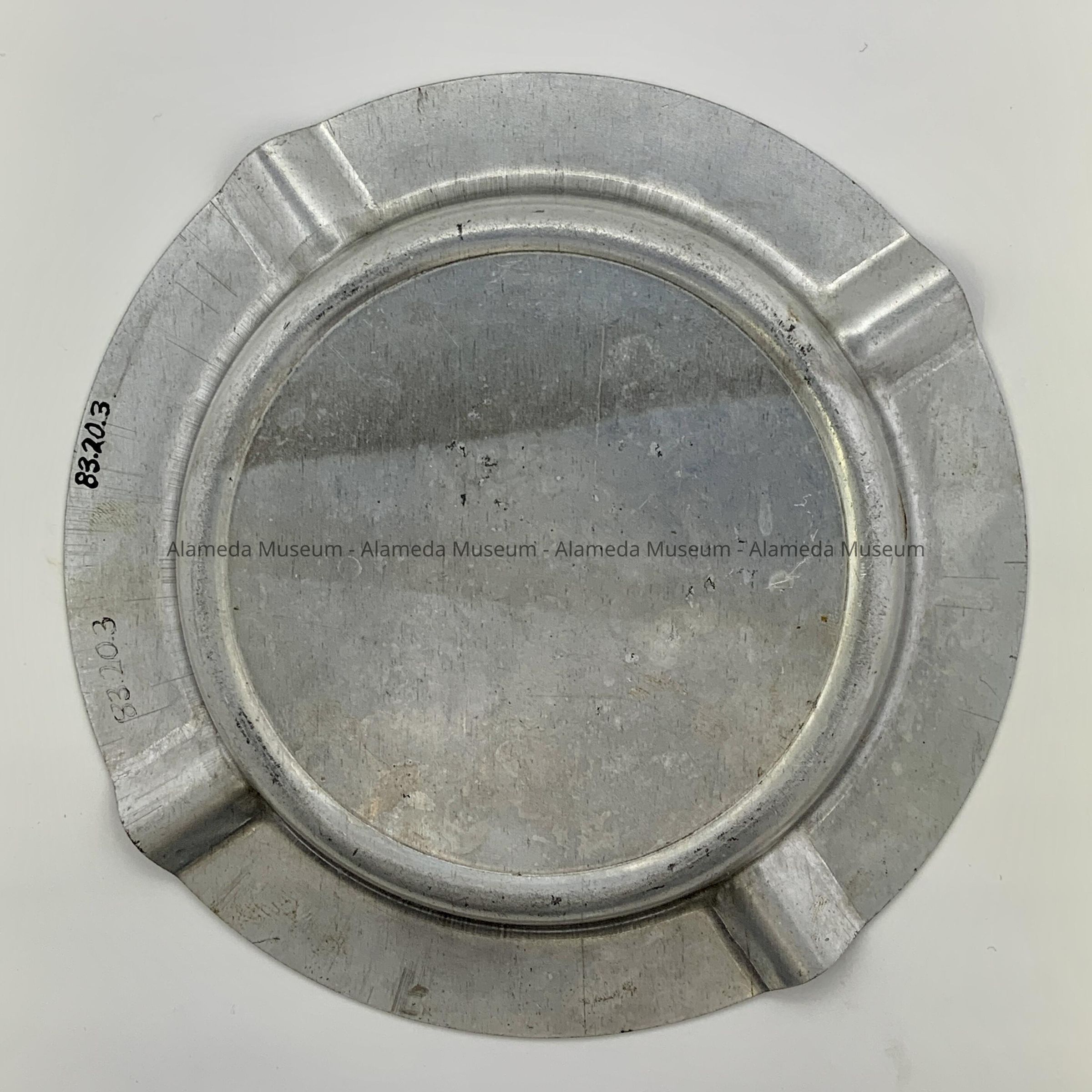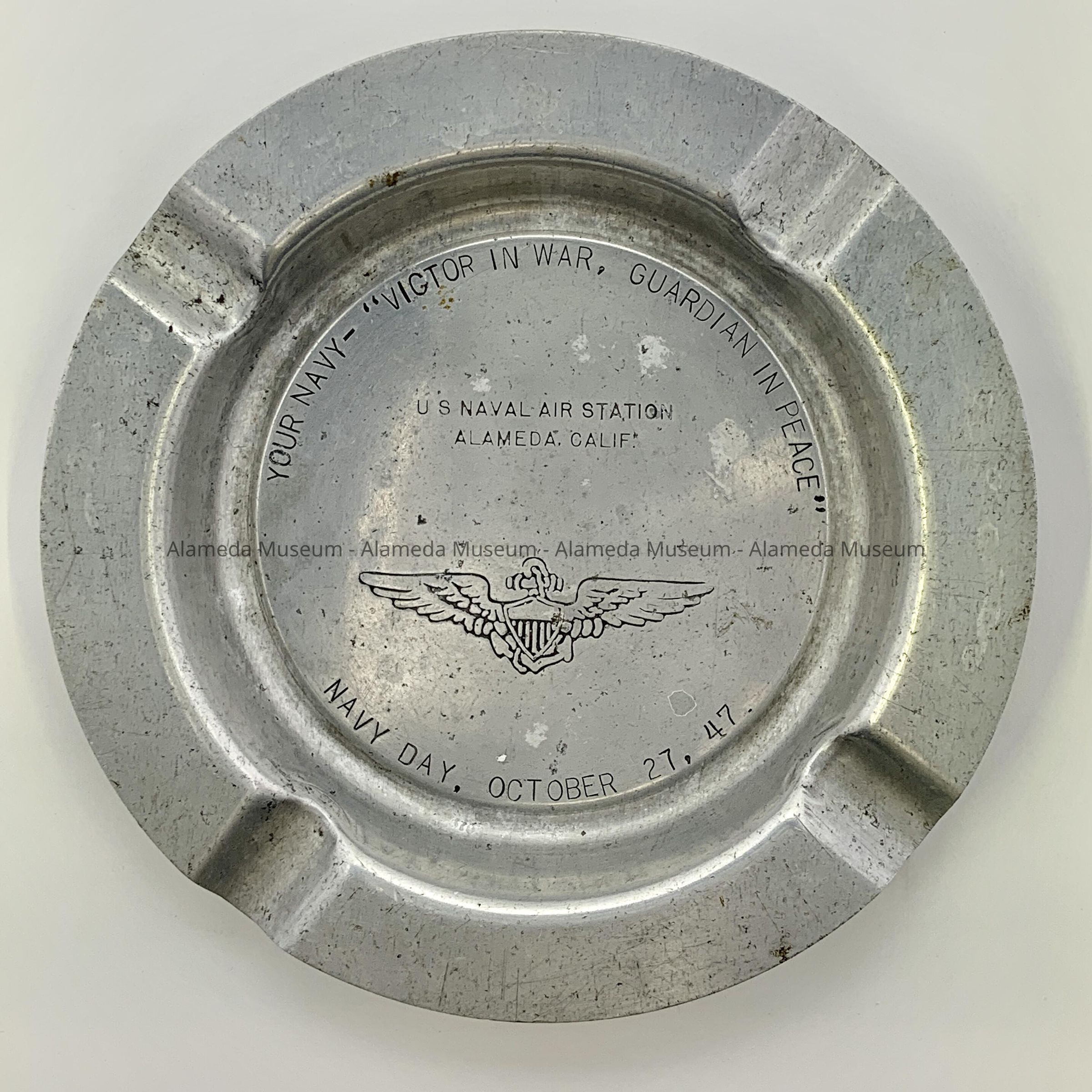 Description: Circular aluminum ash tray with flared rim containing four indentations for cigarettes. Engraving on the interior base of the ash tray states "Your Navy-Victor in War, Guardian in Peace, U. S. Naval Air Station, Alameda, Calif. Navy Day, October 27, 1947."
