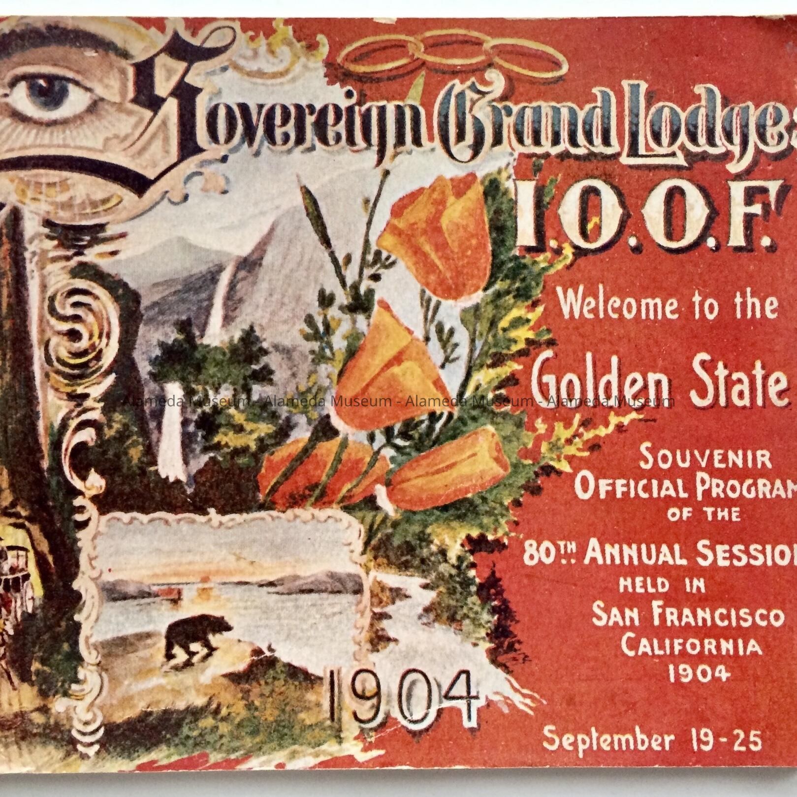 History of Object: Souvenir booklet of the Grand Lodge I.O.O.F. 1904. The last page has a street scene which includes the Jordan residence at 1100 Grand Street. The illustration also includes a caption “Extolling Alameda”. Object given to the Alameda Historical Society prior to 1971 and never catalogued.