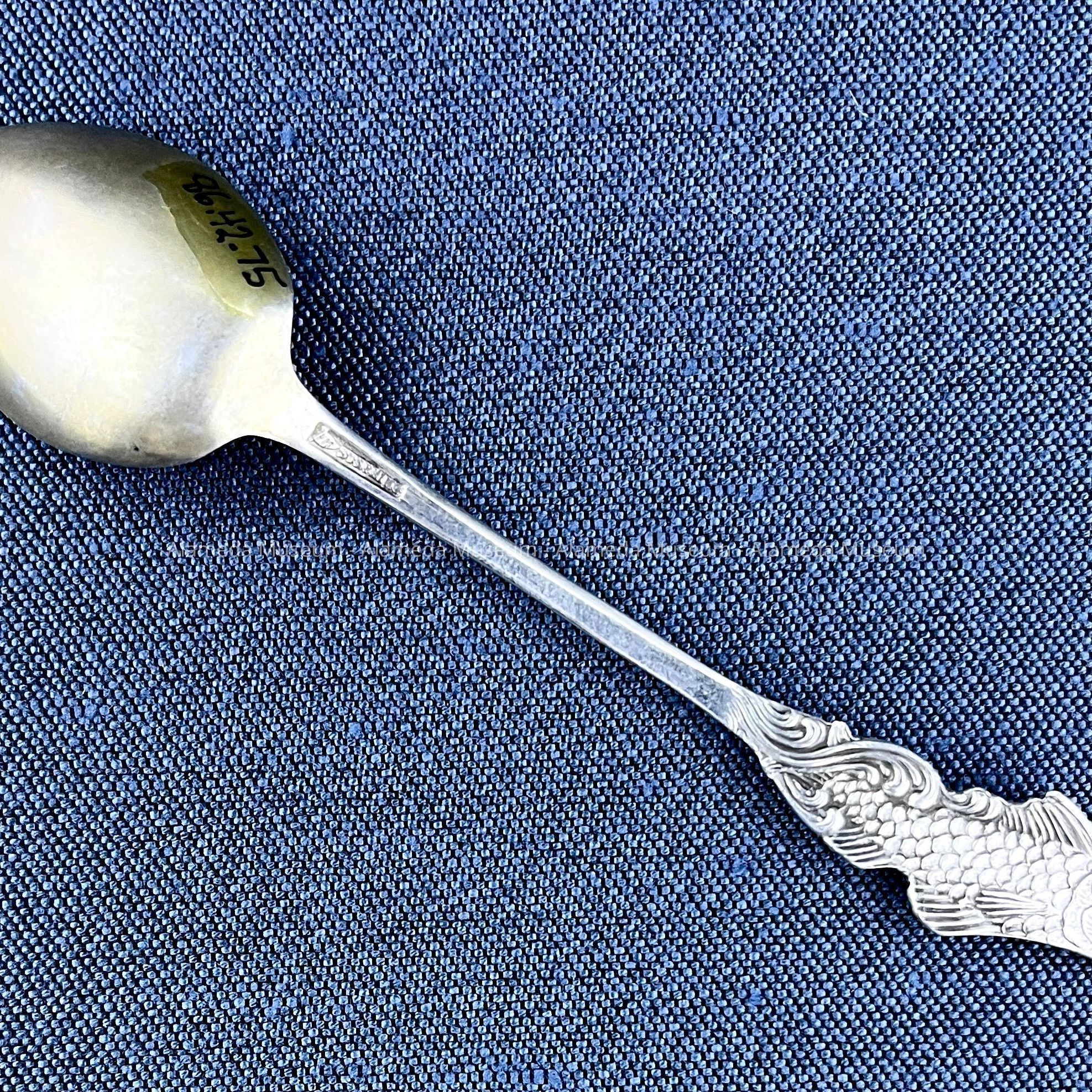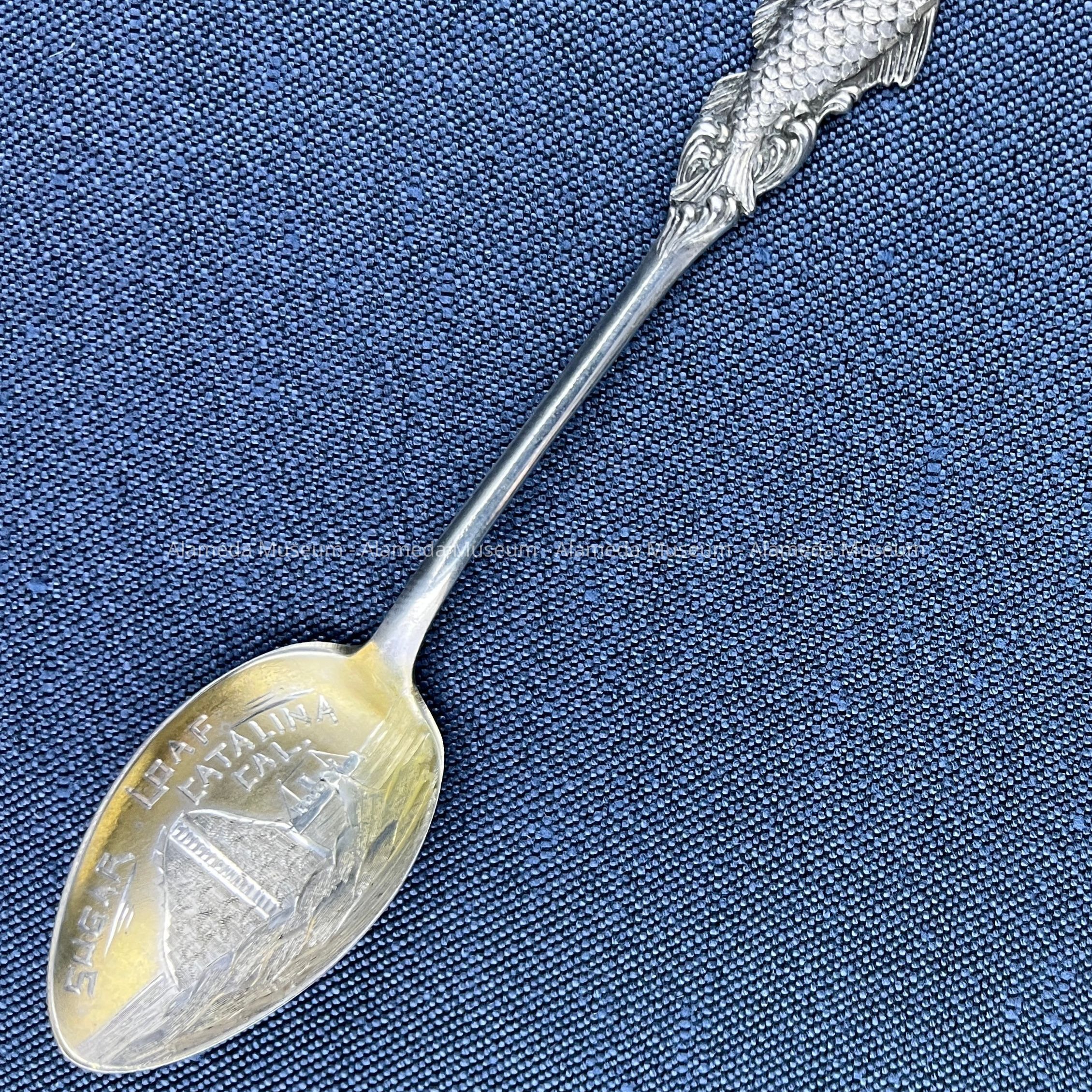 Description: Sterling silver demitasse spoon with engraved and gold washed bowl representing Sugar Loaf rock, Catalina, Cal. A fish serves as a decorative finial on the handle.