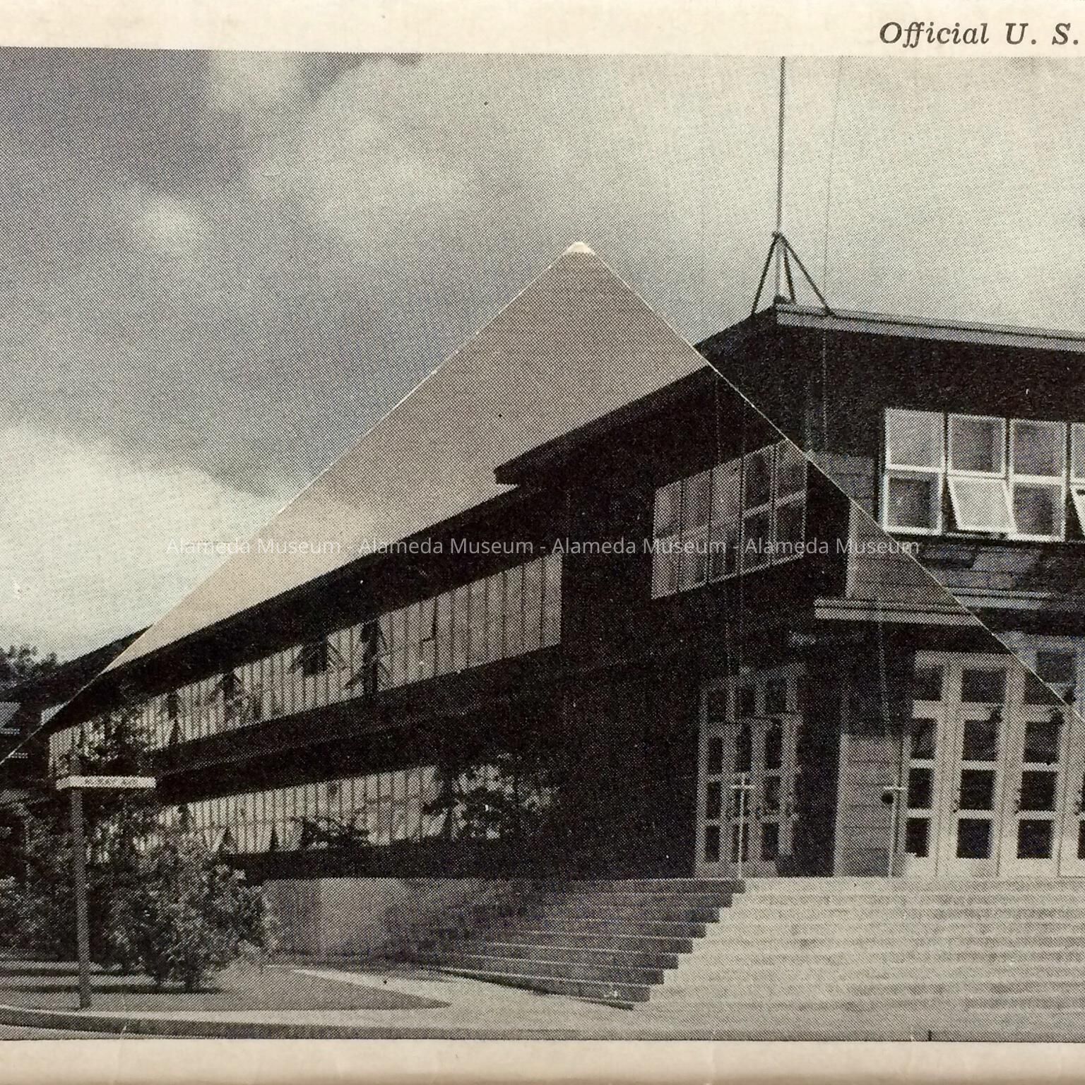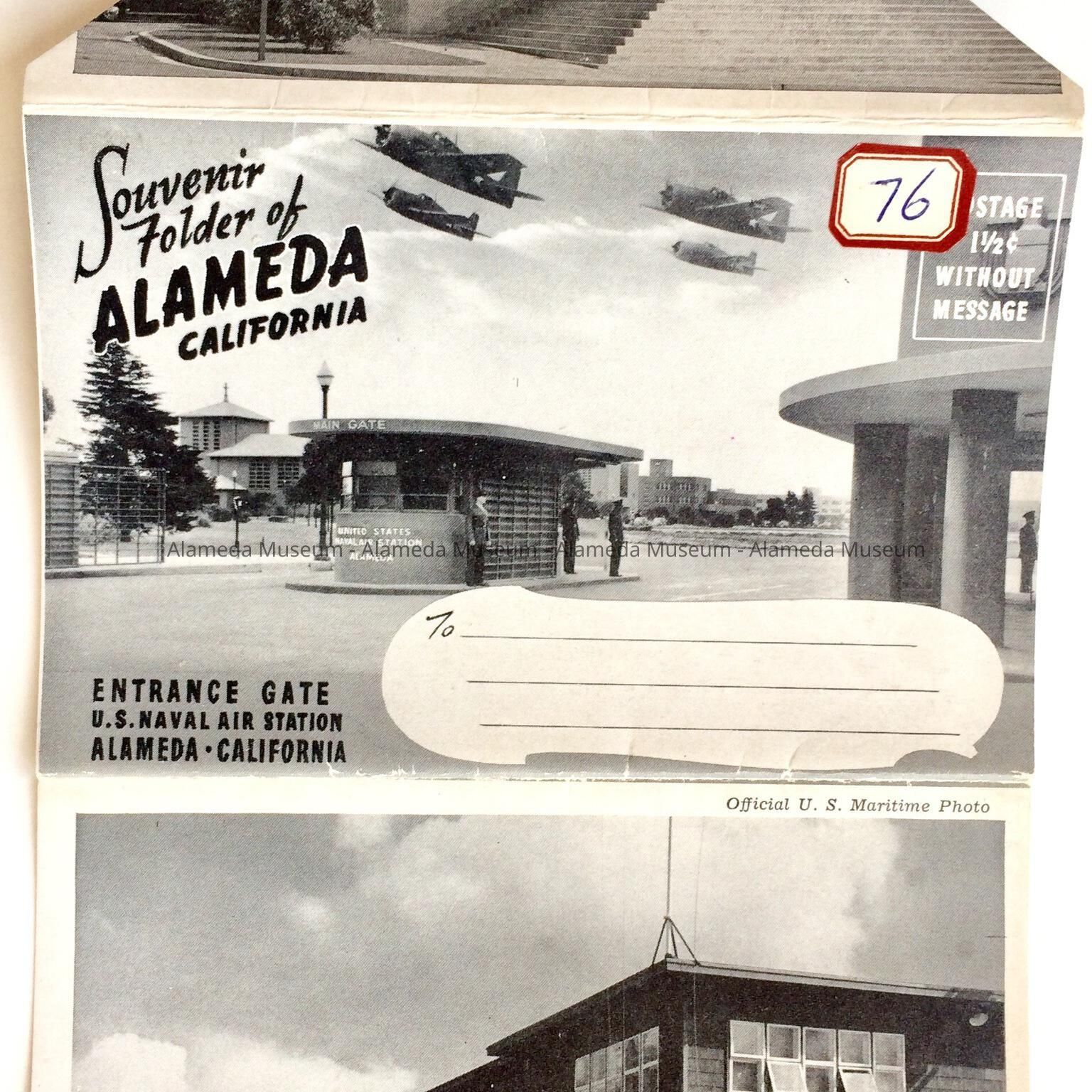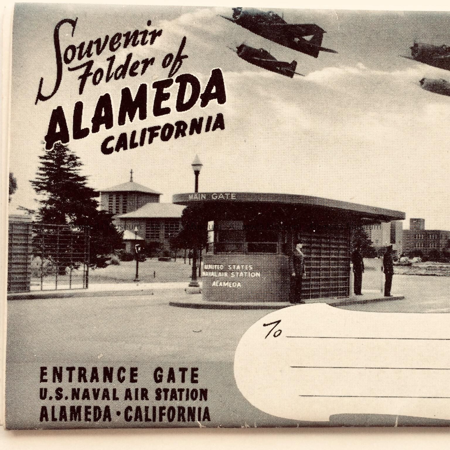 Description: Series of folding postcards in a jacket. Jacket cover has caption "Souvenir Folder of Alameda, CA" and a view of the main entrance of the United States Naval Air Station.