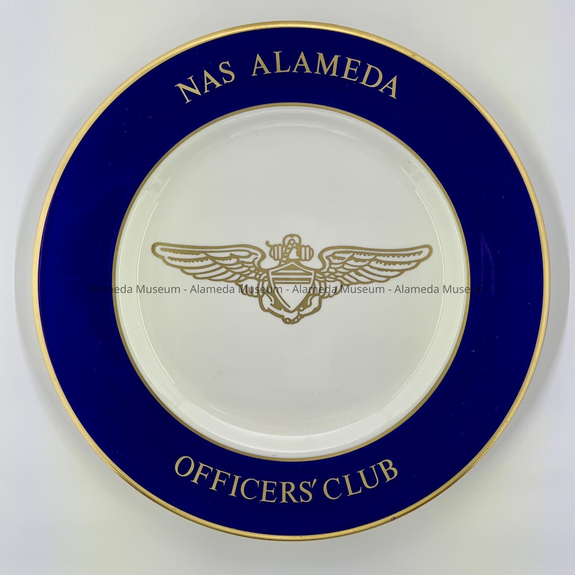 A SEMI- PORCELAIN PLATE, WITH A CENTRAL THEME OF THE MILITARY LOGO IN GOLD ON AN OFF-WHITE-COLORED BACKGROUND. A COBALT BLUE-COLORED "CIRCLE" IS TRIMMED IN A GOLD-COLORED BORDER. PLATE IS LABELED, "NAVAL AIR STATION, ALAMEDA OFFICERS' CLUB." PLATE WAS MANUFACTURED BY THE SYRACUSE CHINA COMPANY, USA.
