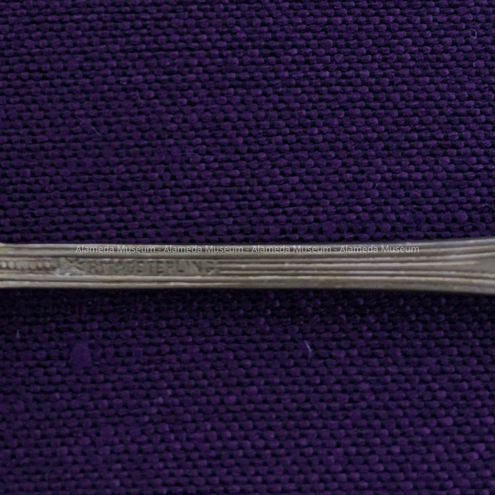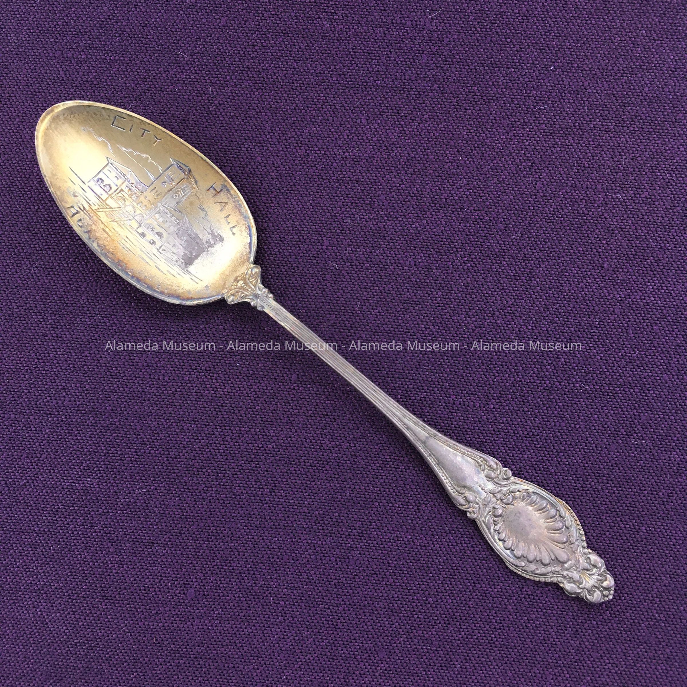 Description: Sterling silver tea spoon with engraved bowl (gold washed) depicting the City Hall building and captioned "City Hall, Alameda, Cal." Size: L-5 inches.