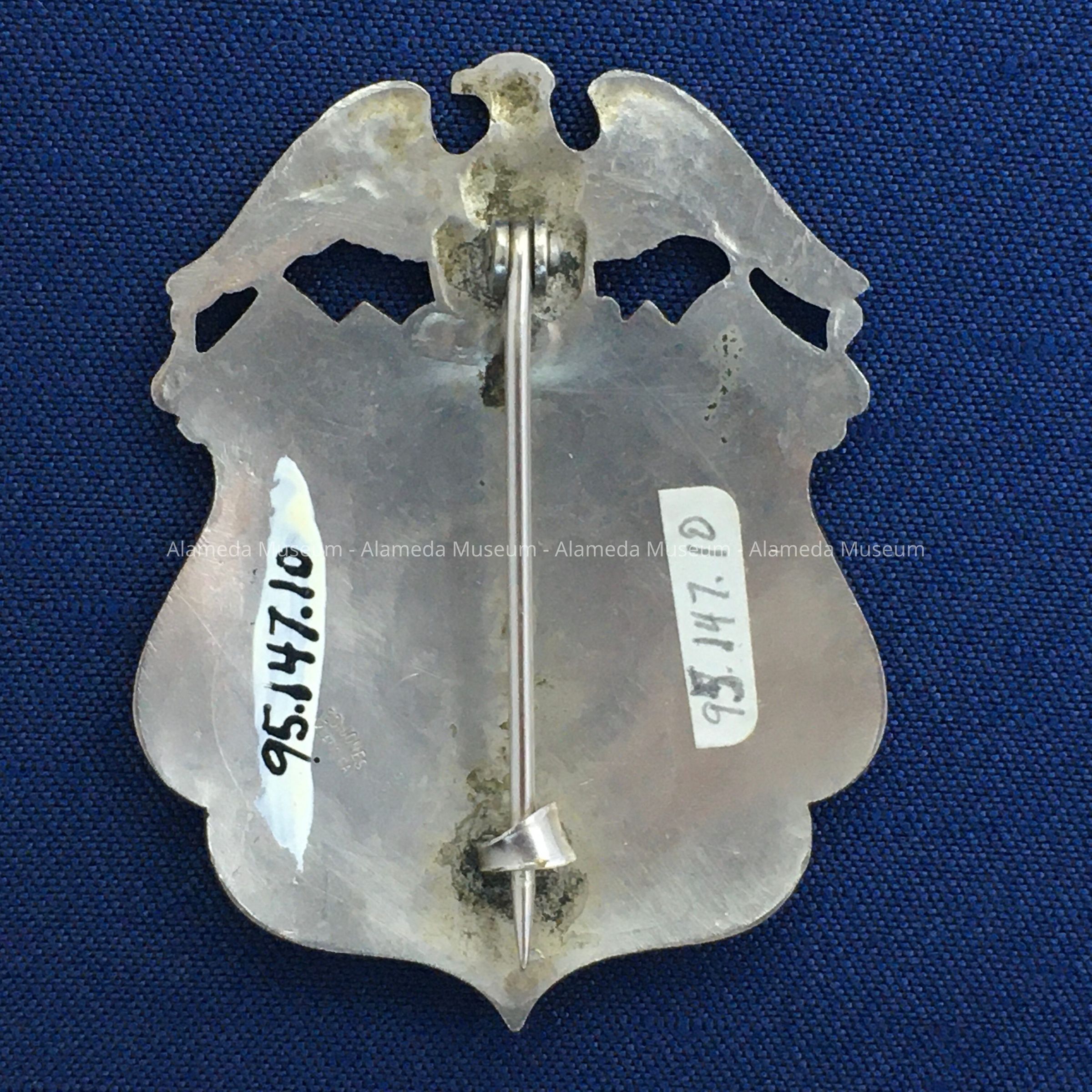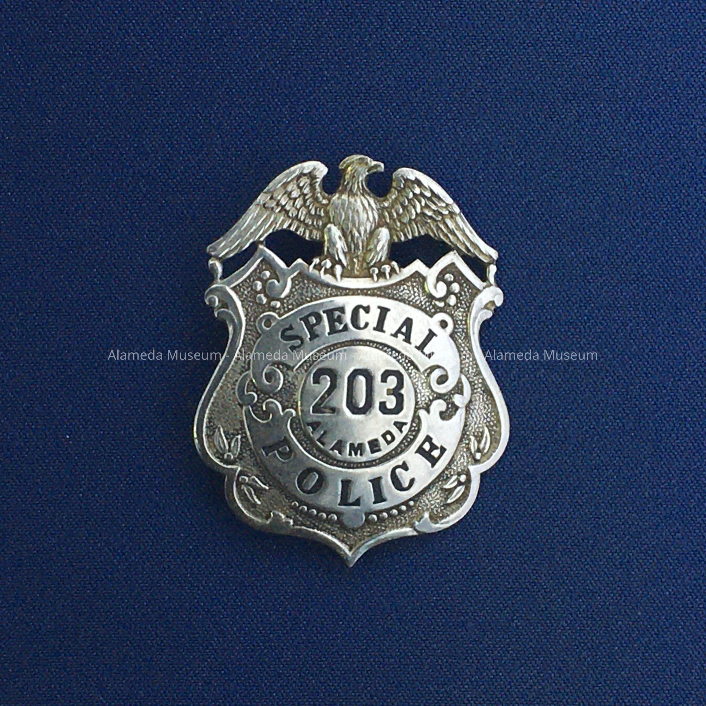 OFFICER'S BADGE, SHIELD-SHAPED, OF CAST- AND EMBOSSED NICKEL PLATED IRON. INCISED LETTERING ACCENTUATED IN BLACK ENAMEL, STATING: "SPECIAL POLICE #203, ALAMEDA." AN ADDITIONAL MOTIF OF AN OUTSTRETCHED EAGLE IS INCORPORATED IN THE BADGE DESIGN.