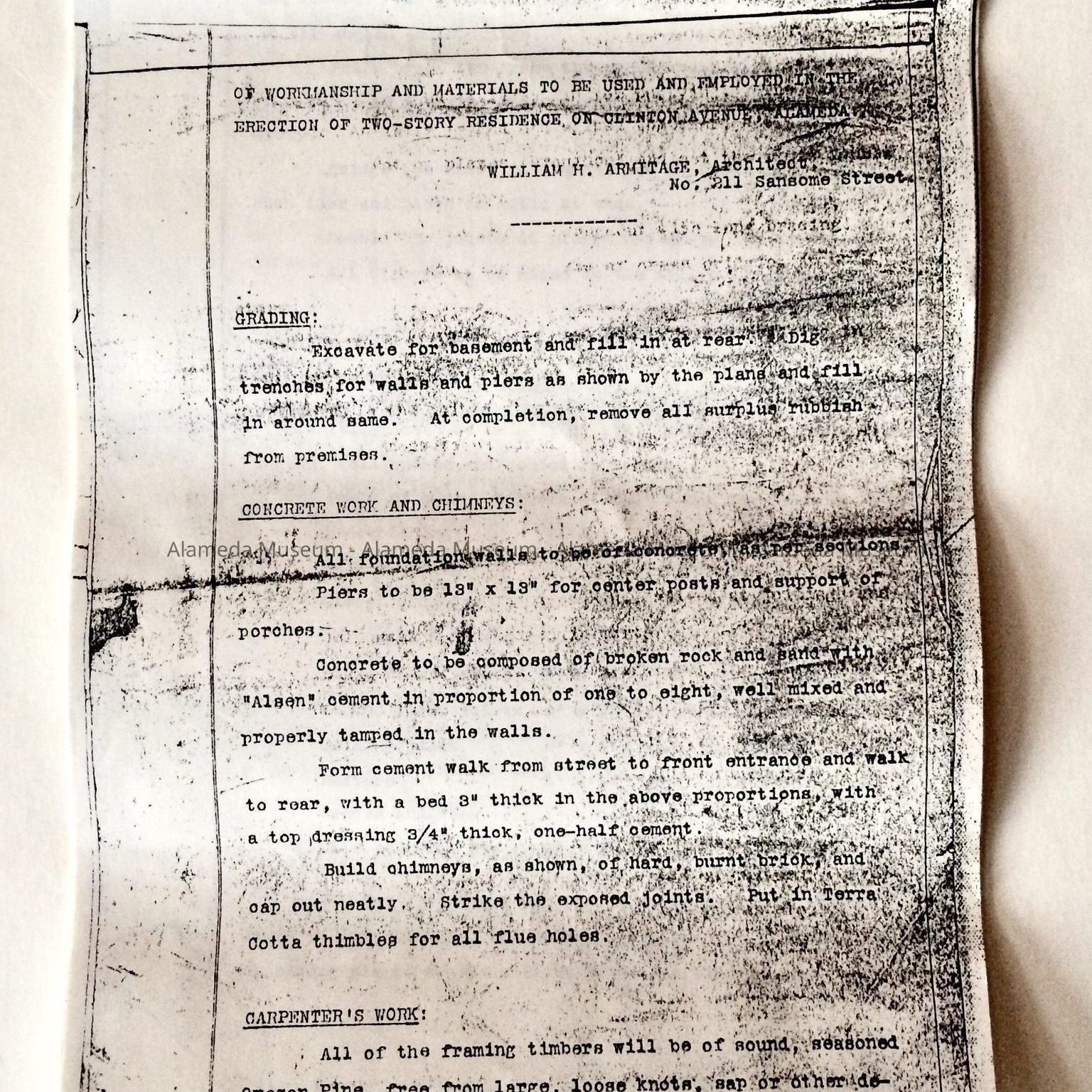 SPECIFICATIONS PREPARED BY WILLIAM H ARMITAGE, 211 SANSOME STREET, SAN FRANCISCO, FOR WORK AND MATERIALS FOR THE ERECTION OF A TWO-STORY RESIDENCE AT 2008 CLINTON AVENUE, ALAMEDA, FOR ROBERT H BLAKE, FATHER OF THE DONOR, DOROTHY DYER.