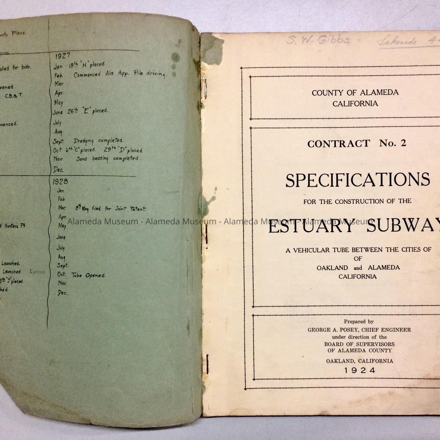 PERSONAL COPY OF SPECIFICATIONS BELONGING TO SHERMAN W GIBBS ---"SPECIFICATIONS FOR THE CONSTRUCTION OF THE POSEY TUBE. PREPARED BY GEORGE A POSEY, CHIEF ENGINEER, 1924."
