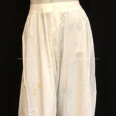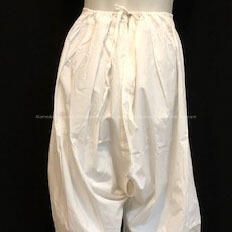Description: Split type drawers of white cotton with machine made lace trim at leg openings. Drawstring waist.