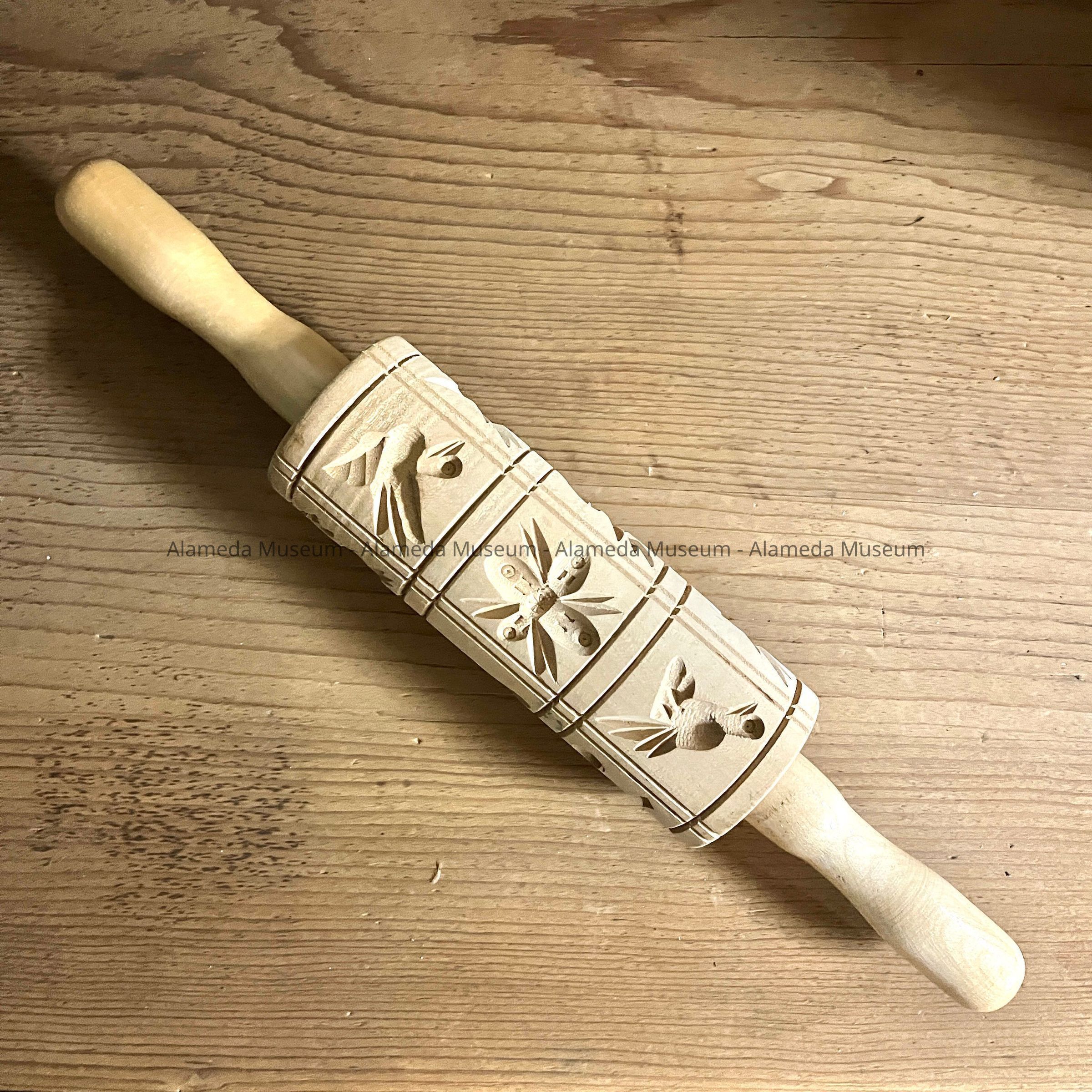 History of Object: Springerle rolling pin from Hofmann's Bakery, used to make traditional German Christmas cookies.