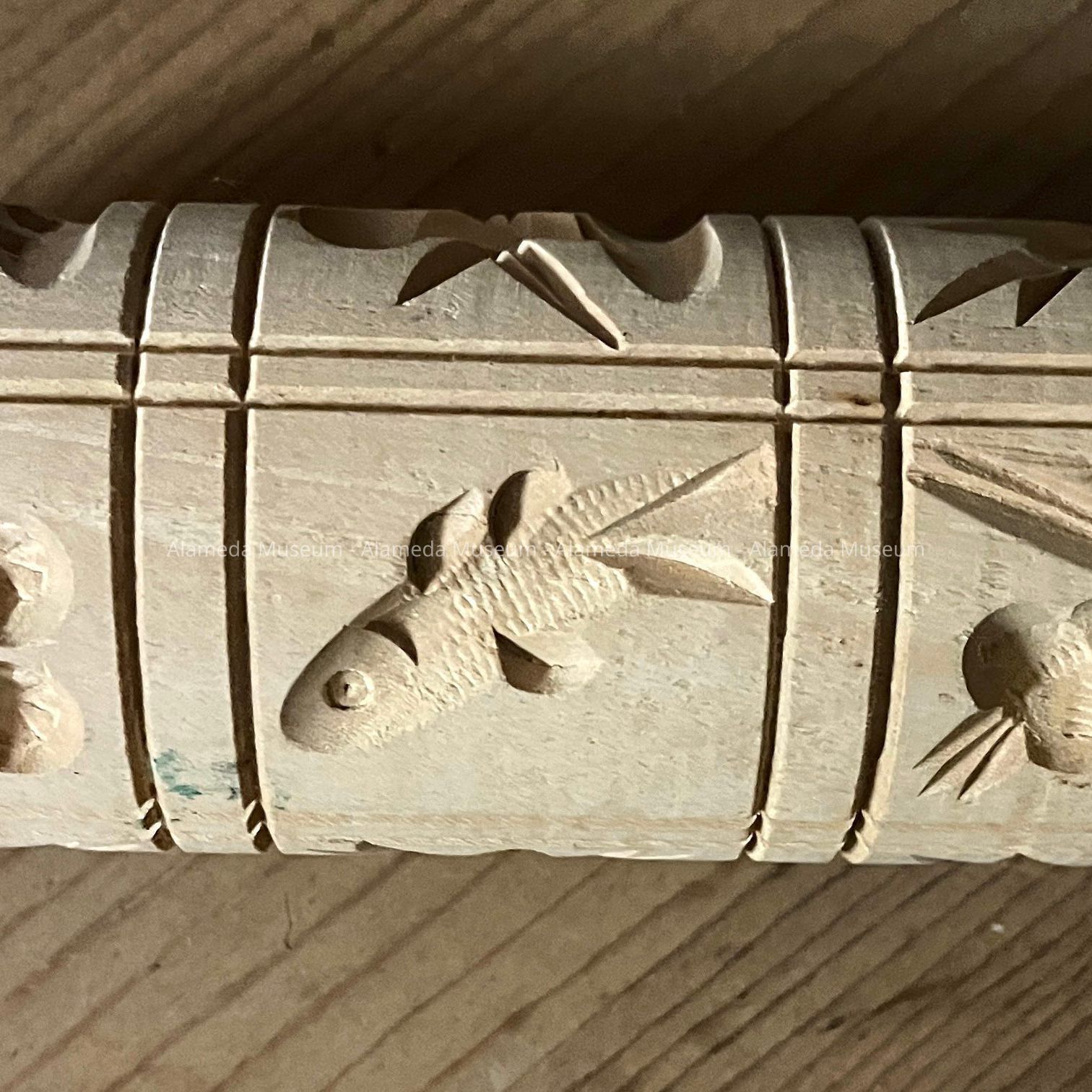 Description: blank wooden roll with two varnished handles; surface of roll has incised carvings of plants, fruit, flowers, birds and a fish.