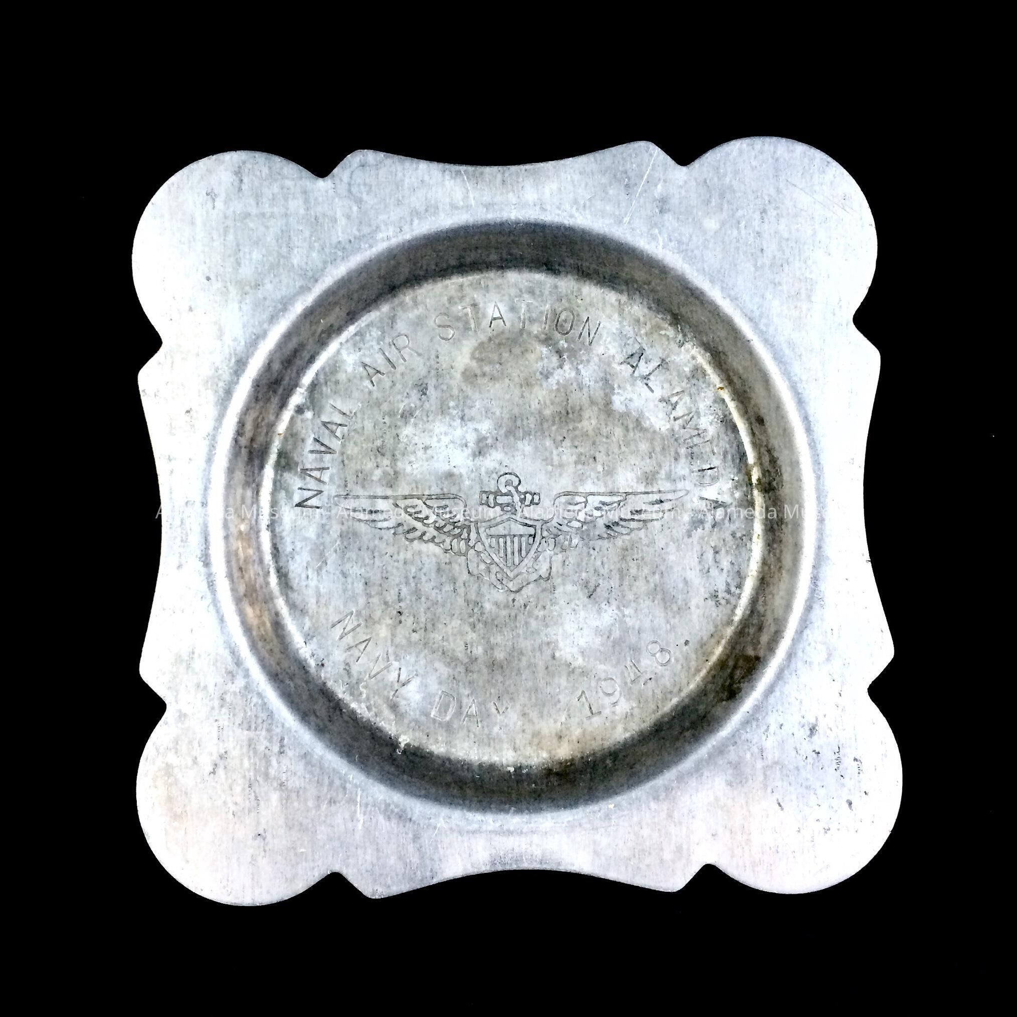 Square shaped aluminum ashtray with incised blocked letters stating "Naval Air Station, Alameda, Navy Day 1948".