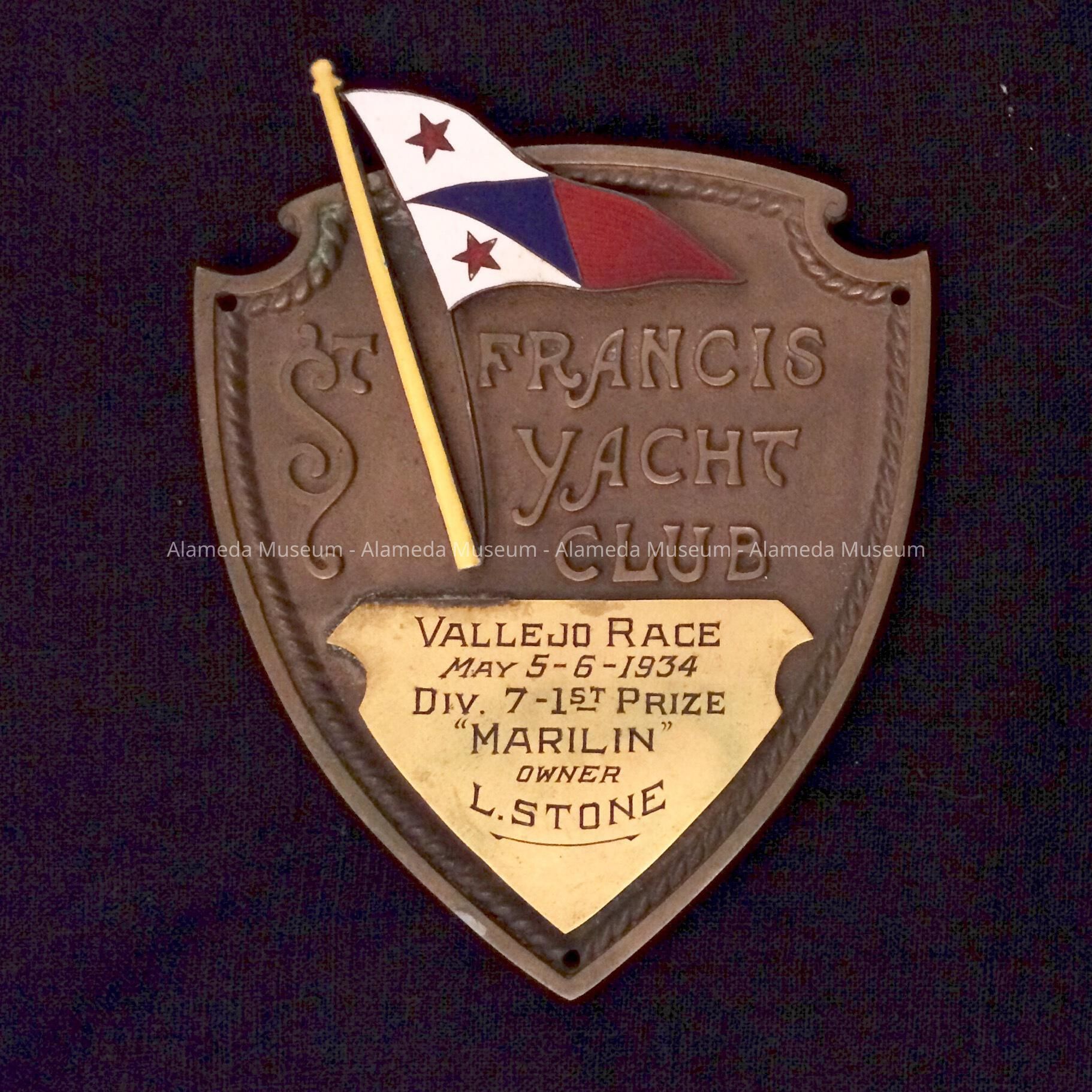 Description: A patinated shield shaped brass plaque with a bold caption, "St. Francis Yacht Club". Part of the plaque decorations include a simulated flag in red, blue, white, and yellow enamel. Lower section of the shield has a shiny triangular field engraved with "Vallejo Race May 5-6-1934 Div. 7-1st Prize "Marilin" owner L. Stone'.