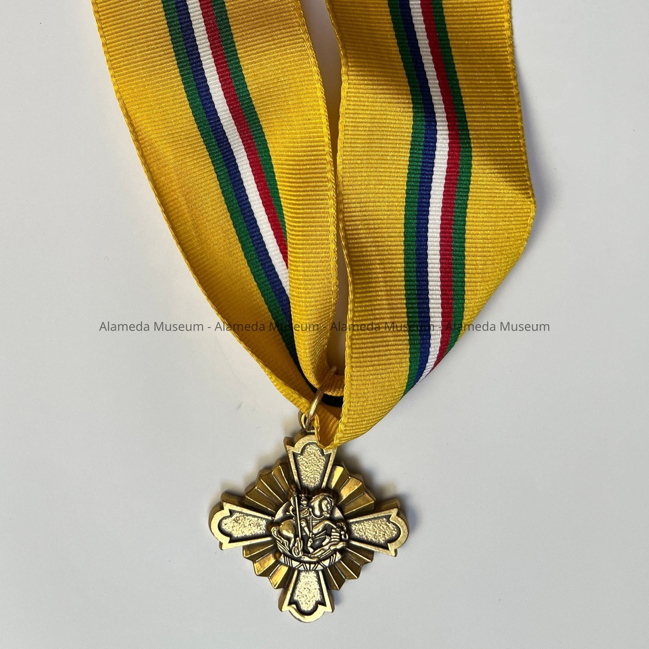 History of Object: St. George emblem - an award for adults for outstanding service for Catholic Boys Scouts - awarded to David Marshall Rose. Mr. Rose (b. 1942, d. 2018) lived in Alameda for many years, and was active in St. Philip Neri parish, including as a charter member of the St. Philip Neri Boys Scouts of America Troop 78.