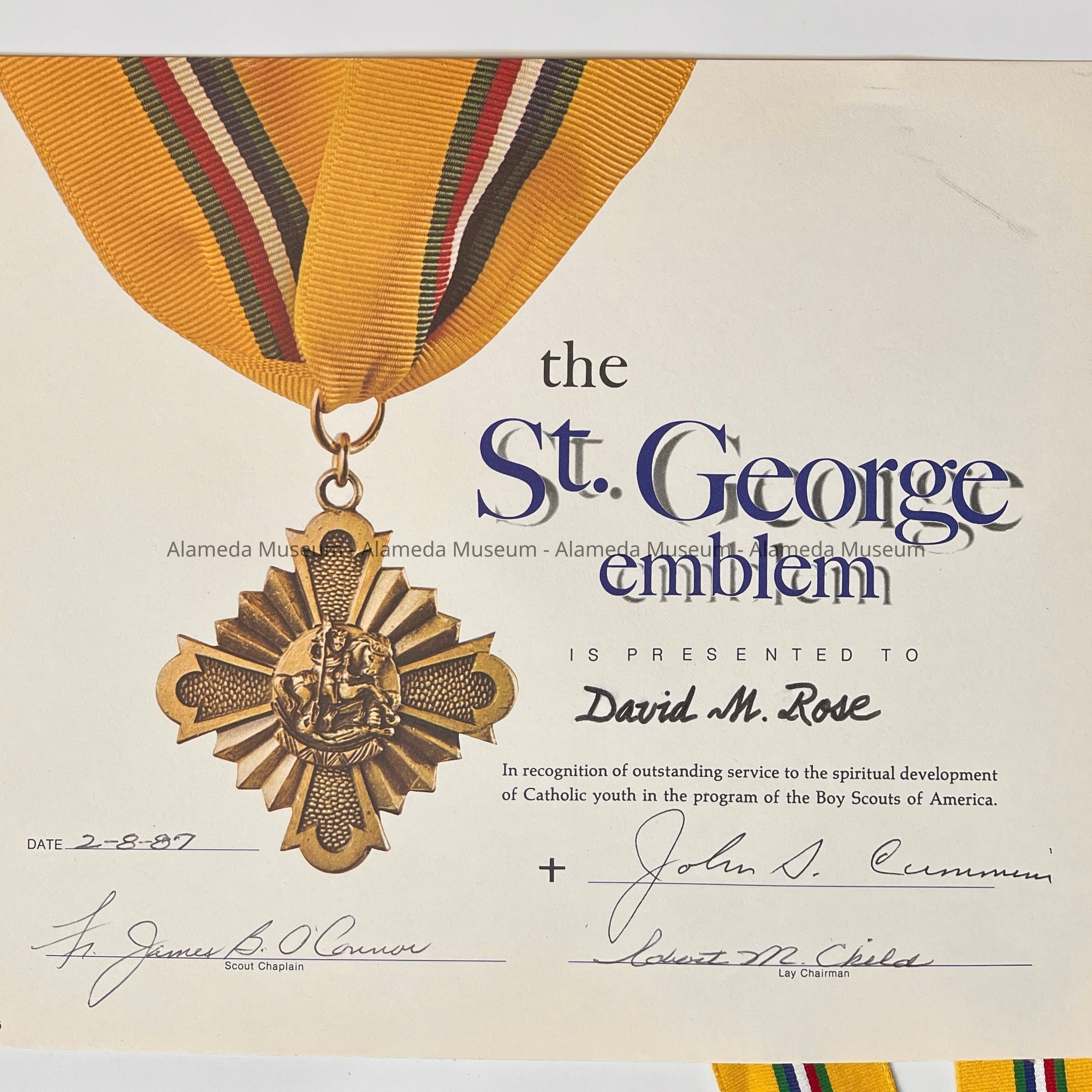 Description: A medal (B) and pre-printed Certificate (A) with signatures, name, and date filled in by hand, featuring the image of the medal. The medal depends from a yellow ribbon with thin stripes of green, red, white and blue in the center. The medal shows the image of a man on a horse, with spear and dragon under the horse. Preprinted text certificate states: 'the St. George emblem / is presented to /[filled in by hand:] David M. Rose / In recognition of outstanding service to the spiritual development / of Catholic youth in the program of the Boy Scouts of America. Date: 2-8-87.