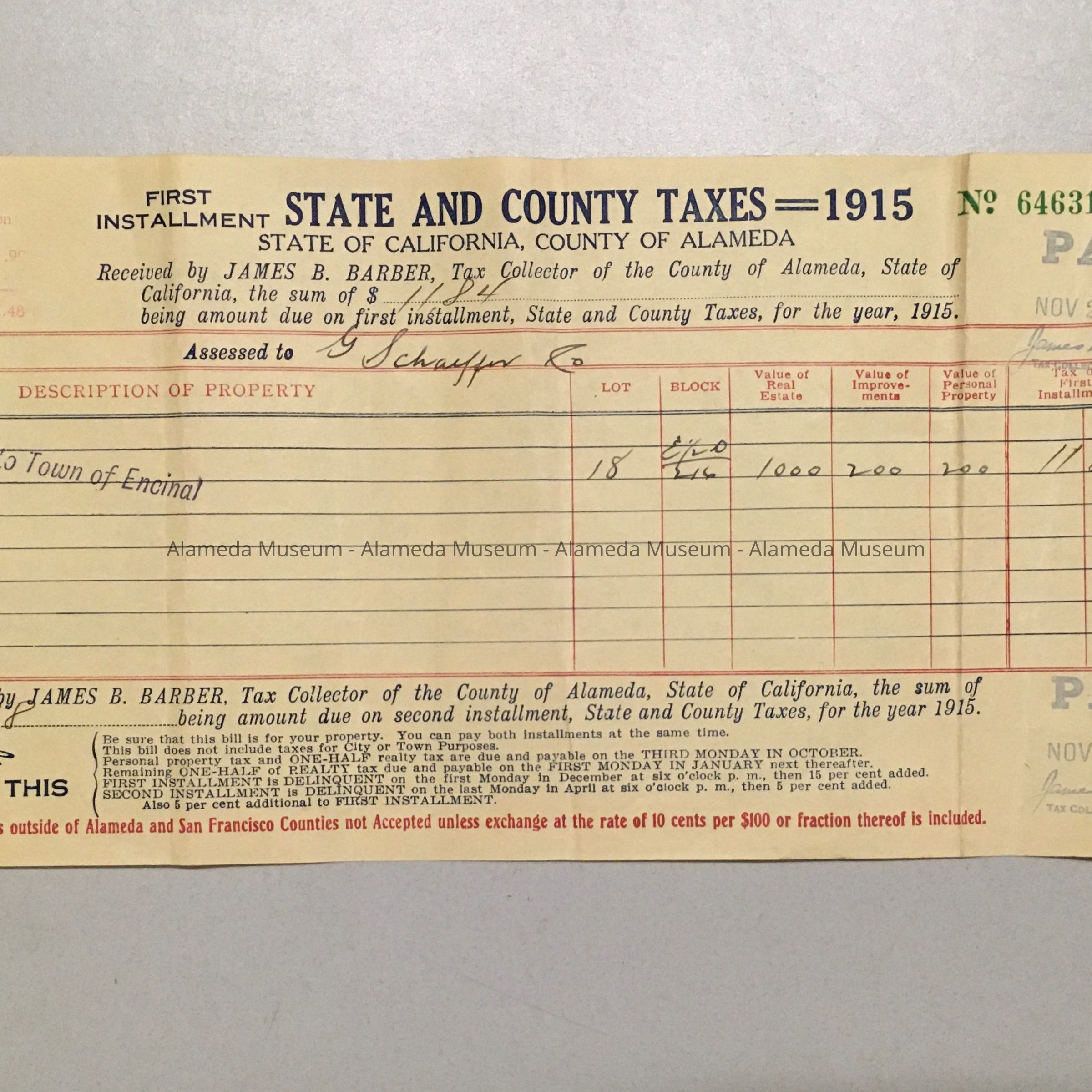 HISTORY OF OBJECT: STATE AND COUNTY TAXES ASSESSED TO GEORGE SCHAEFFER FOR 1915, FOR PROPERTY LOCATED AT 2236 ALAMEDA AVE., ALAMEDA, PRESENT SITE OF THE ALAMEDA HIGH SCHOOL.