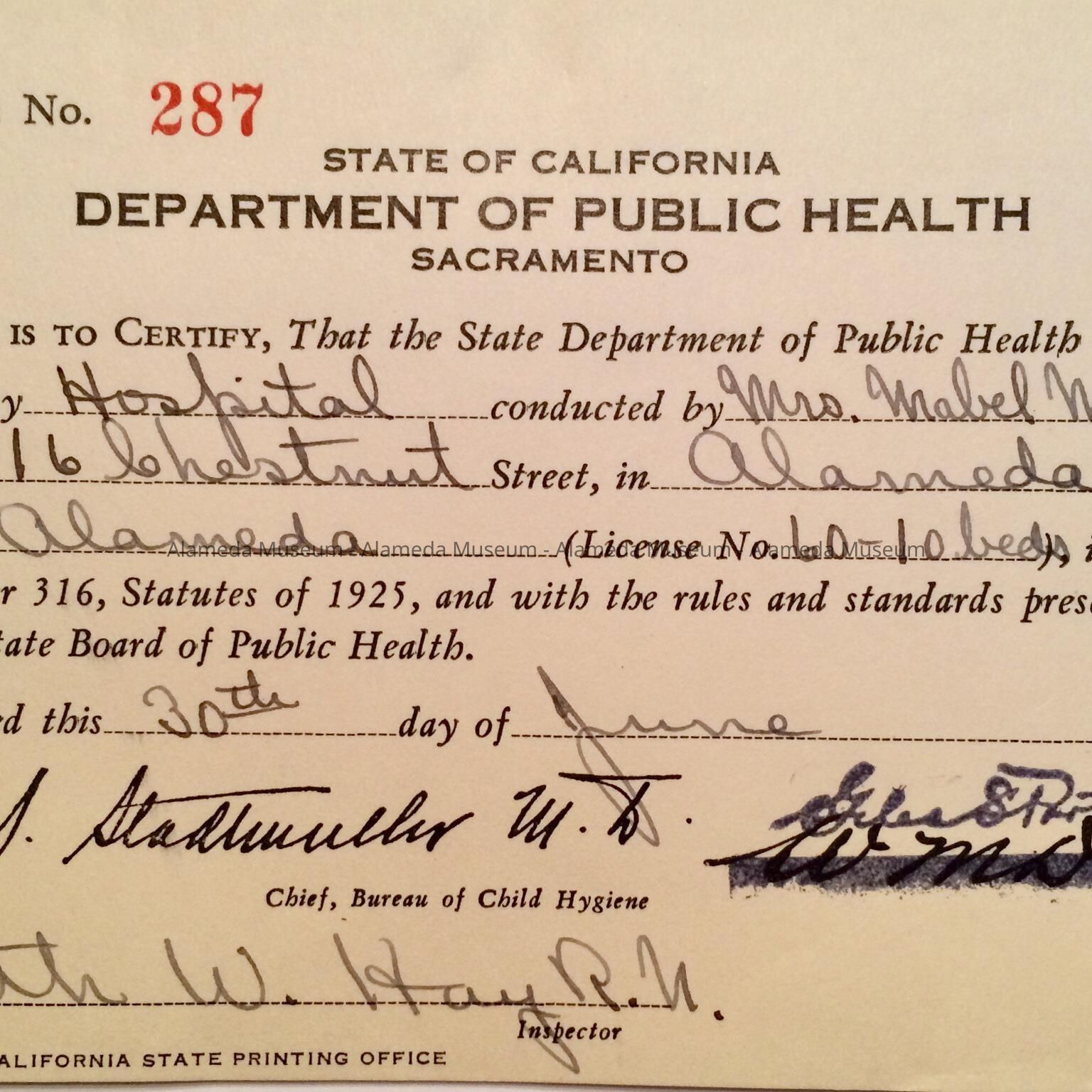 History of Object: Certificate of operation awarded Tennant's Maternity Hospital, issued by the state, June 30th, 1931