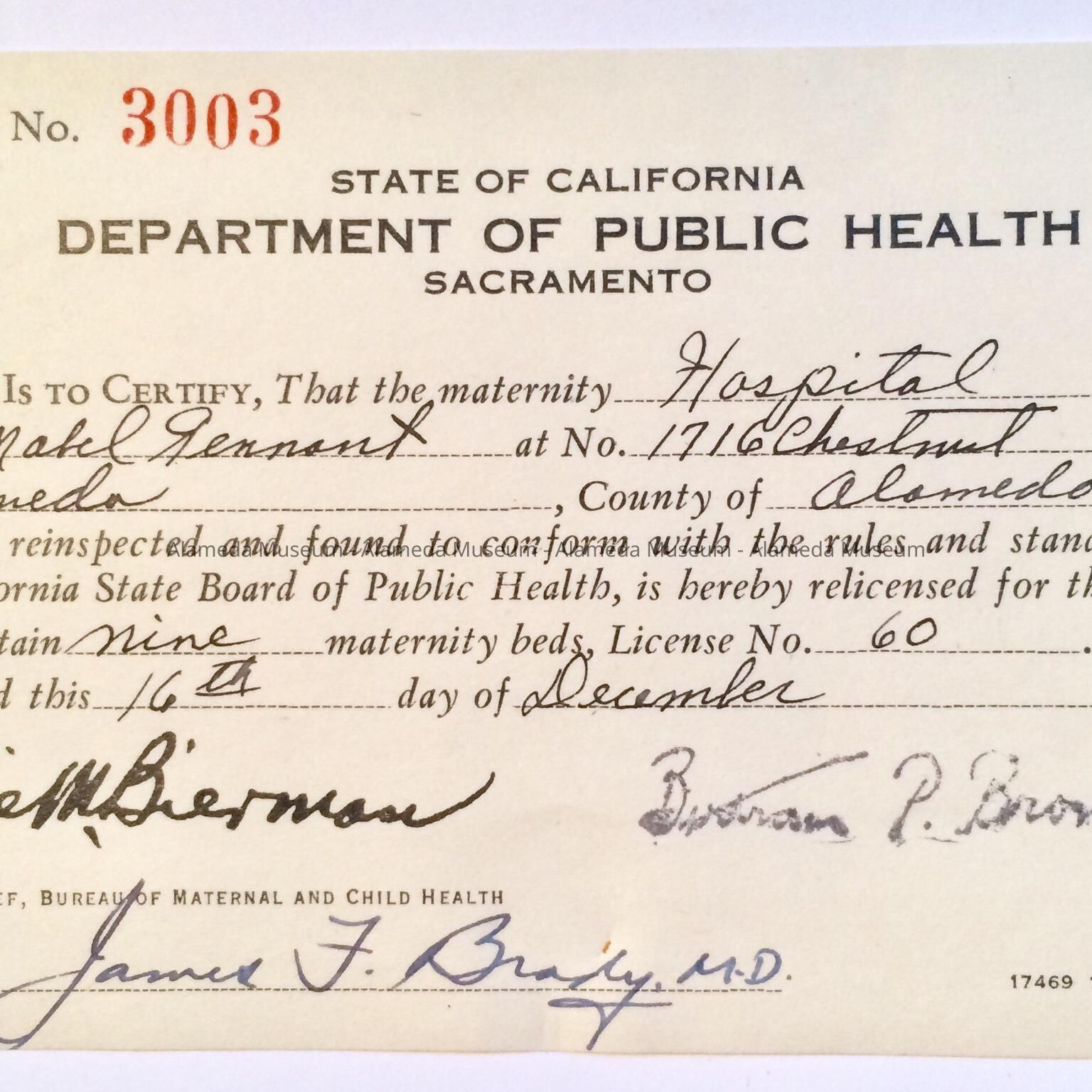 History of Object: Certificate of operation awarded Tennant's Maternity Hospital, issued by the state, December 16, 1942