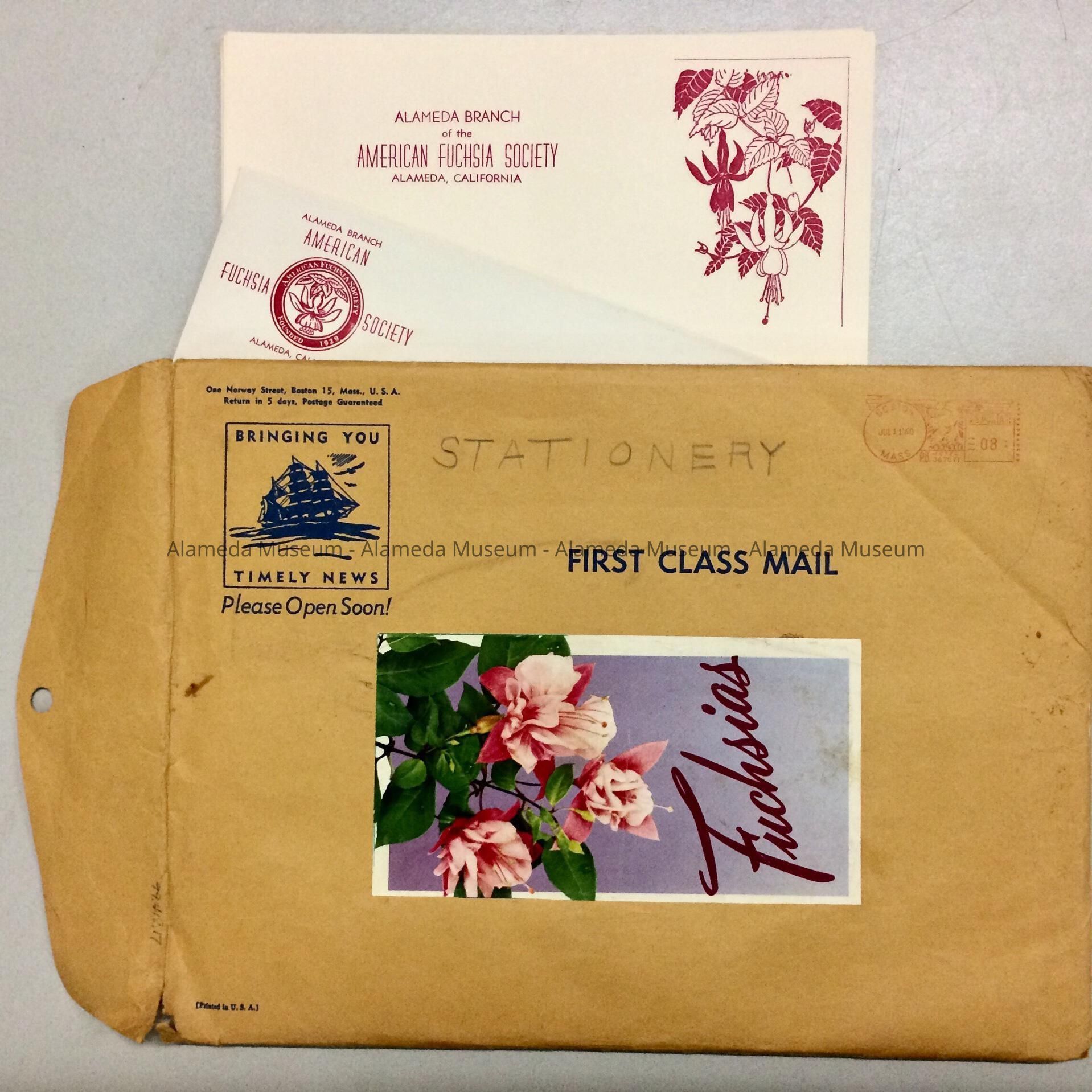 Description: Manila envelope containing stationery and envelopes. Stationery has bold printed caption "Alameda Branch, American Fuchsia Society, Alameda, CA". It is illustrated with fuchsias in rose colored type.