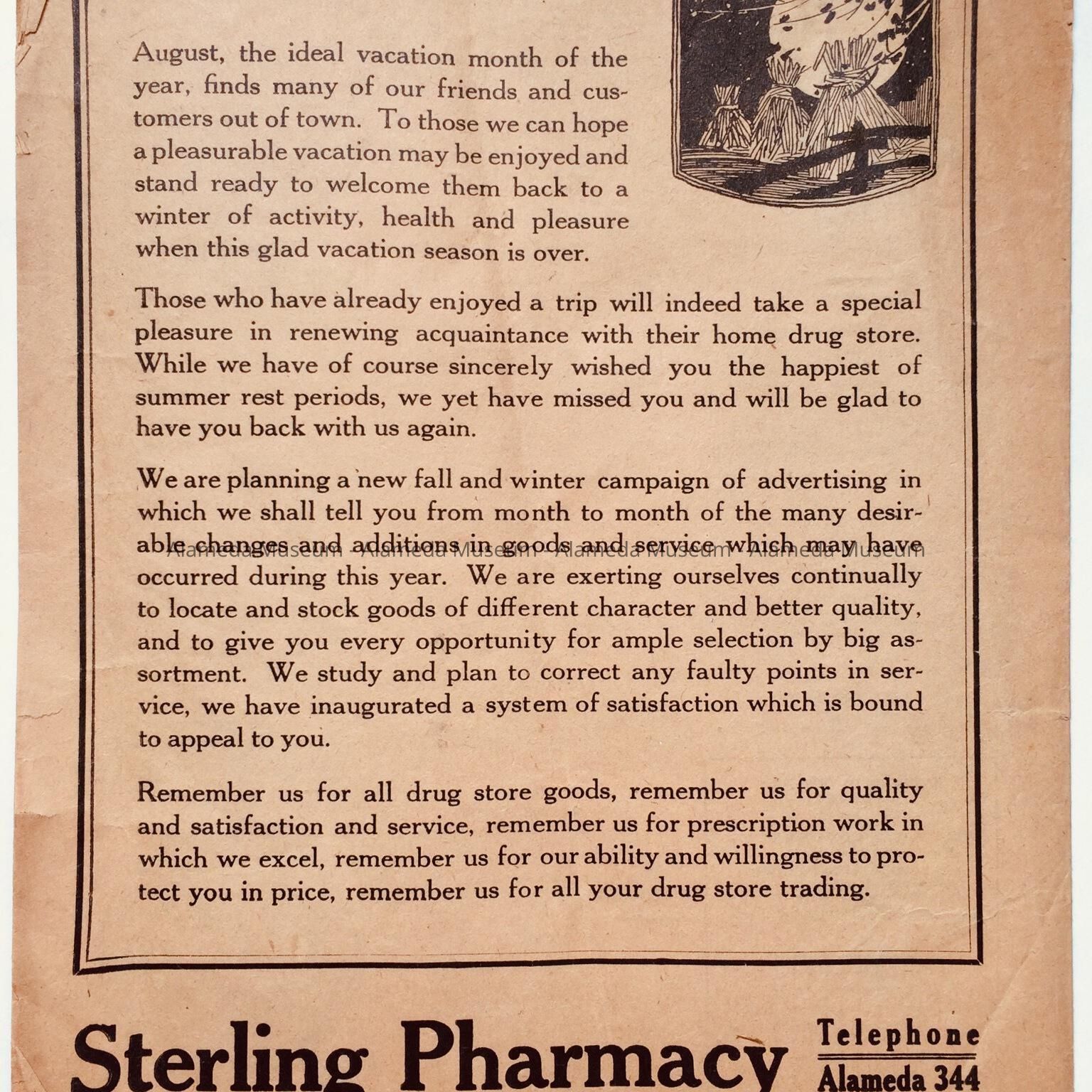 History of Object: It is an advertising pamphlet containing short articles and poems which was put out by the Sterling Pharmacy, prescription specialists, Chestnut Station, Alameda, California. It was a monthly publication issued to patrons.