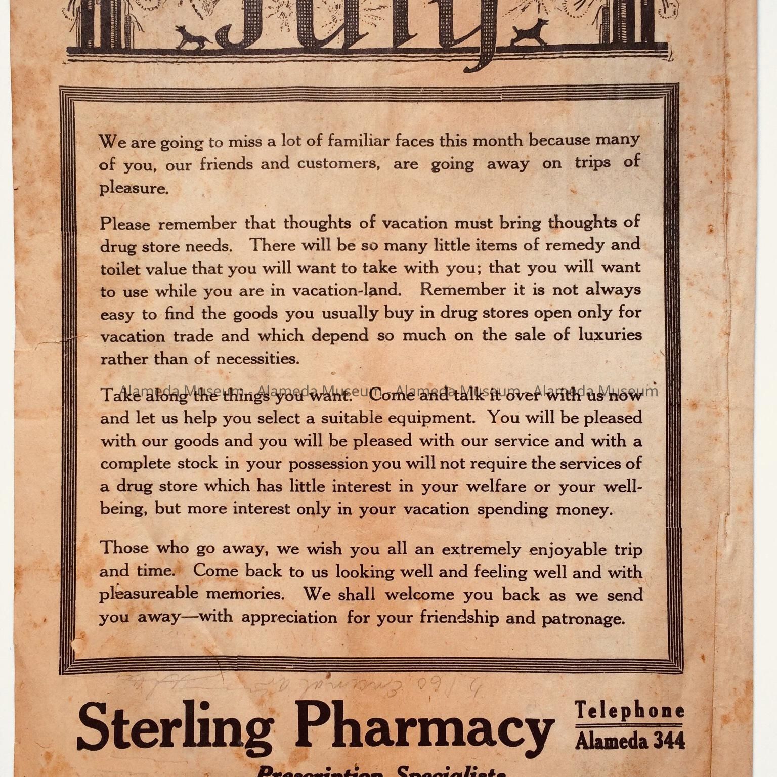 History Of Object: It is the July, 1919 edition advertising pamphlet containing short articles and poems which was put out by the Sterling Pharmacy, prescription specialists, Chestnut Station, Alameda, California.