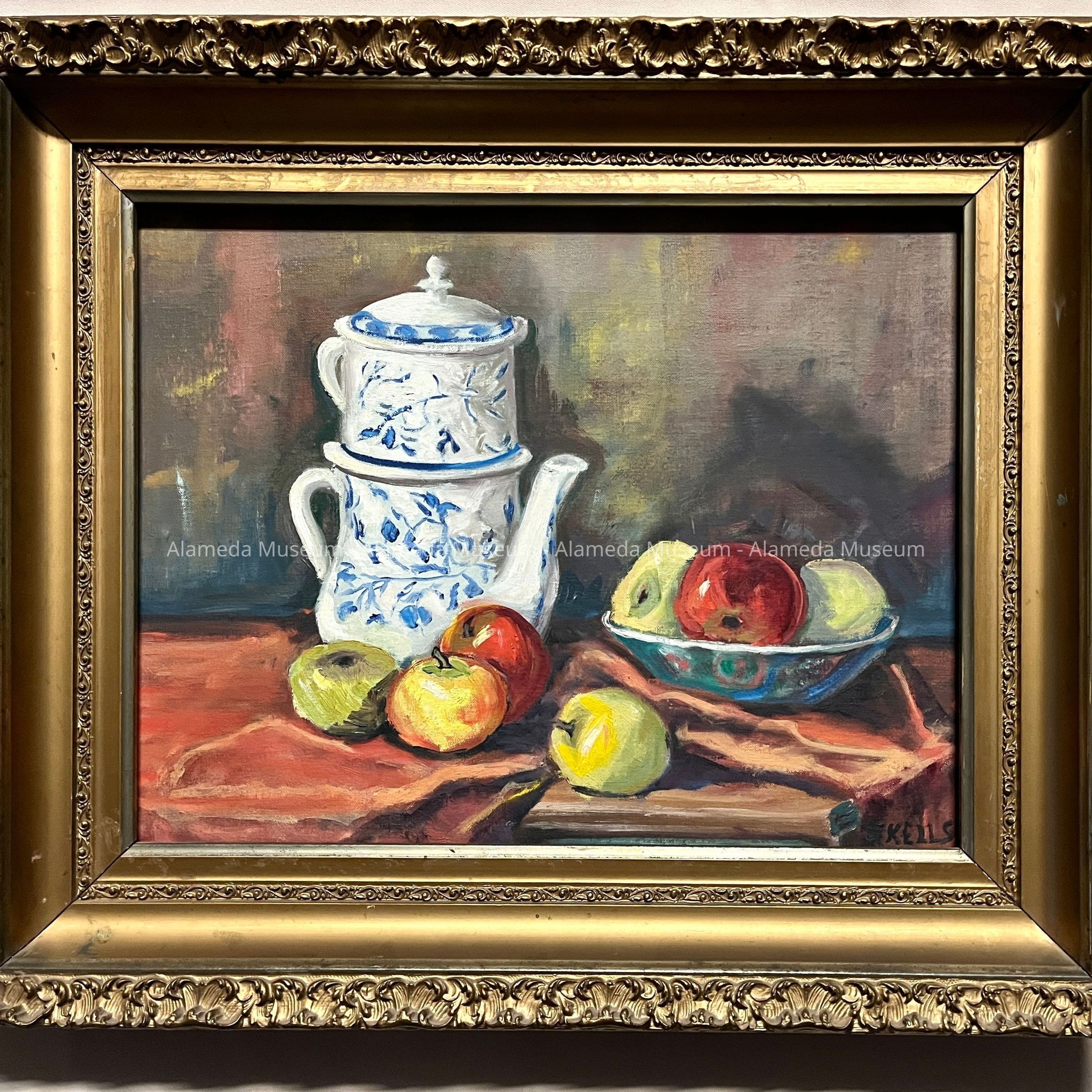 DESCRIPTION: A STILL LIFE PAINTING CONSISTING OF A TEAPOT AND A GROUP OF APPLES THAT IS OIL ON ACADEMY BOARD. IT IS SIGNED, "SKELLS", AND ON THE BACK IS WRITTEN: "JEN SKELLS, 2624 CLAY ST, ALAMEDA, LA 2-8792." THE PIECE IS IN AN ANTIQUE FRAME WITH A BORDER OF CAST JESSO IN A GILT FINISH.