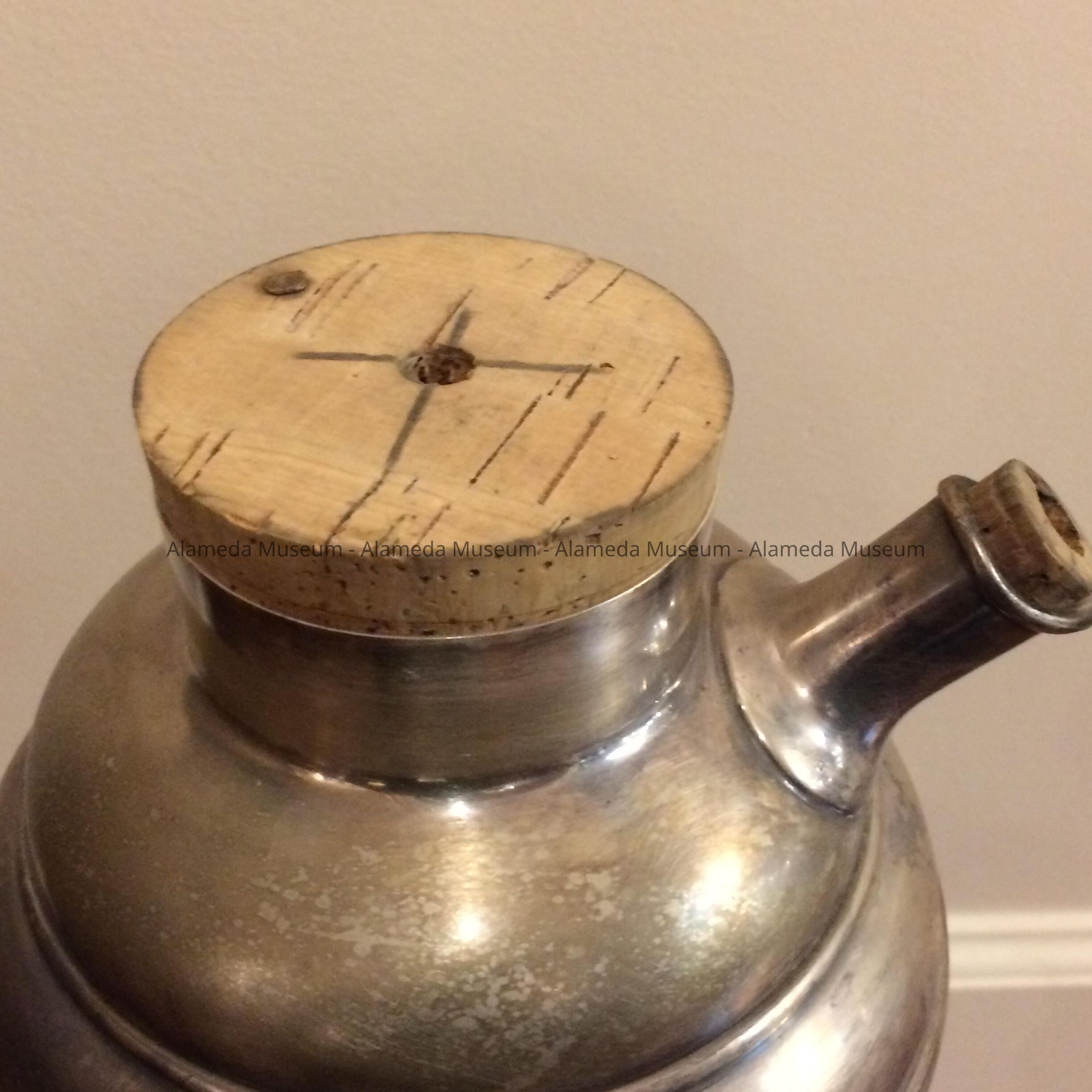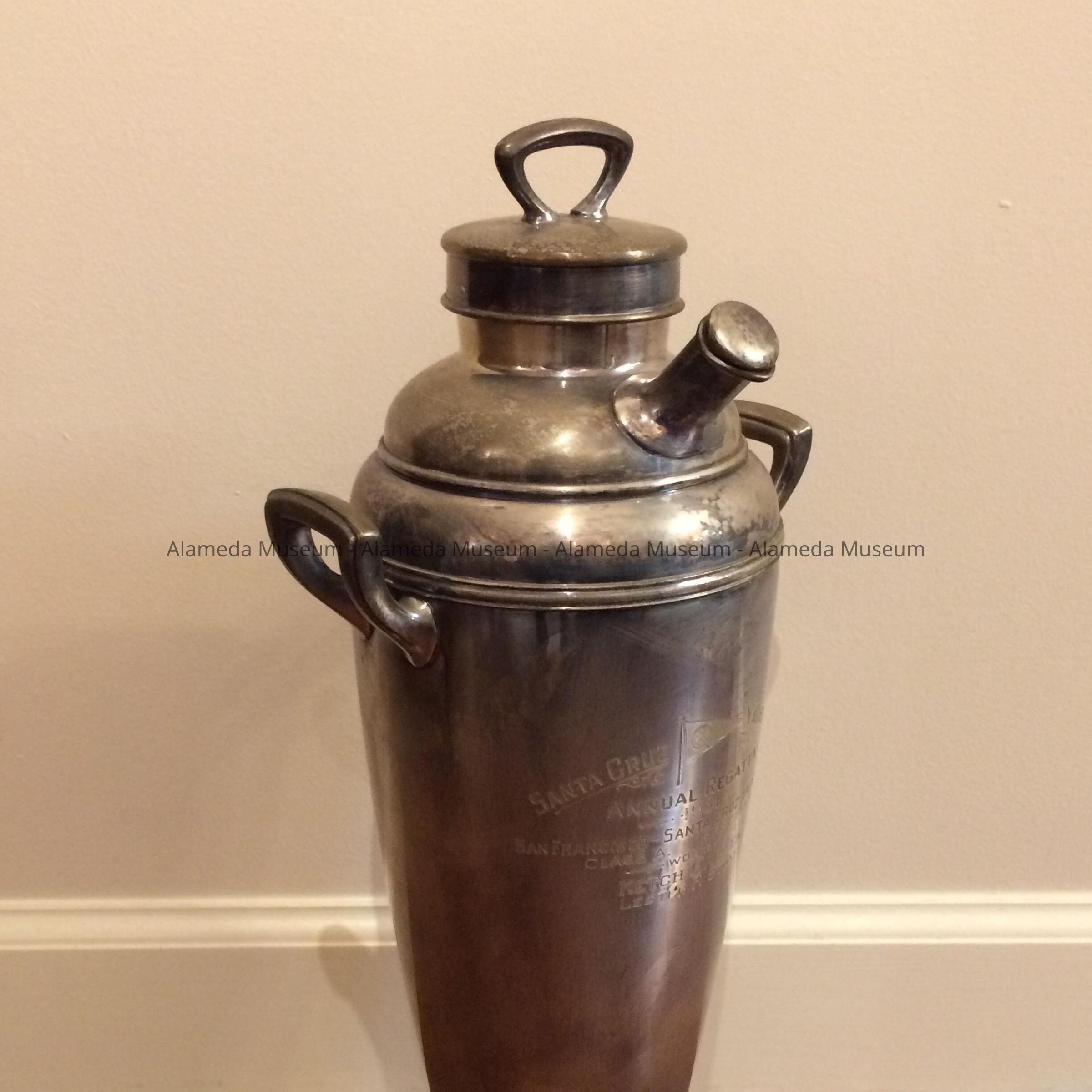 Description: A silver plated double handled trophy with a removable lid and a spout with a stopper. It's base is signed "Wallace EPWM (electroplated white metal) V-816". It has a large cocktail shaker design.