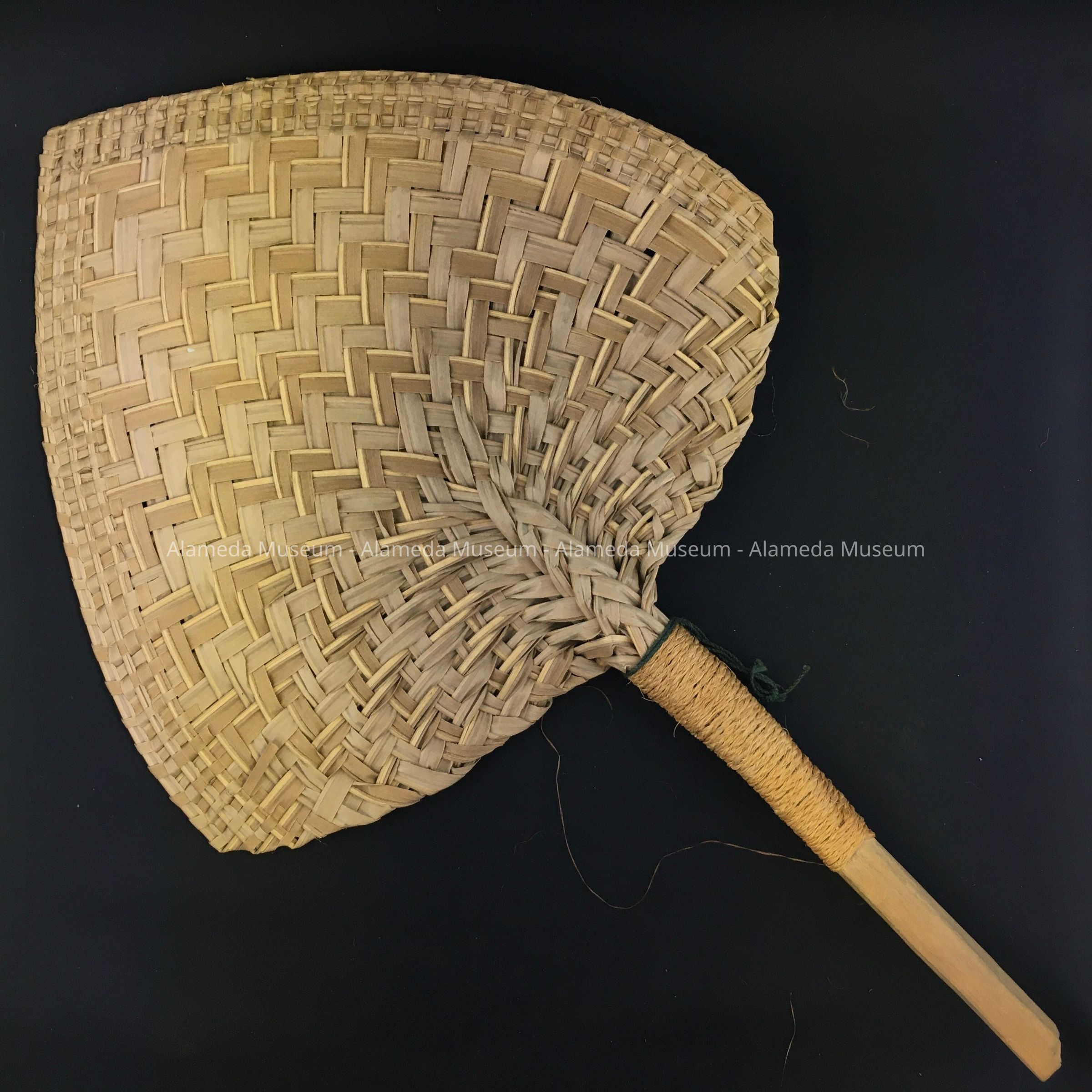 A STRAW FAN FROM THE COLLECTION OF CAROLYN POTTER, WASHINGTON SCHOOL TEACHER. THE FAN WAS AMONG SEVERAL GIFTS FROM STUDENTS IN SAMOA, IN GRATITUDE FOR CHRISTMAS BOXES SENT TO THEM FROM ALAMEDA. THE COLLECTION WAS DONATED TO THE ALAMEDA MUSEUM IN 1956 AND NOT CATALOGED UNTIL 2009. (SEE CARD 09.26.1 FOR FURTHER DETAILS.)
