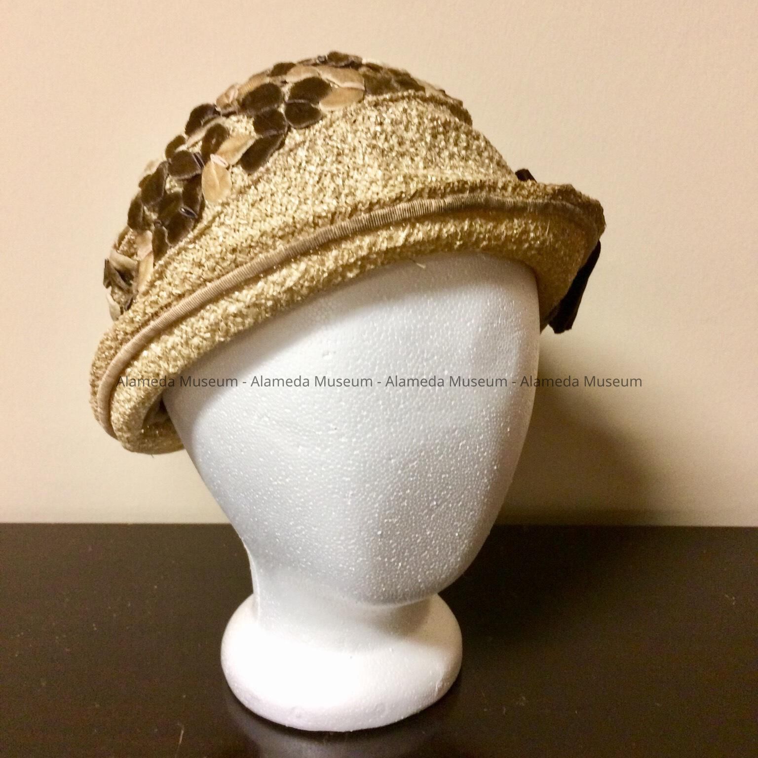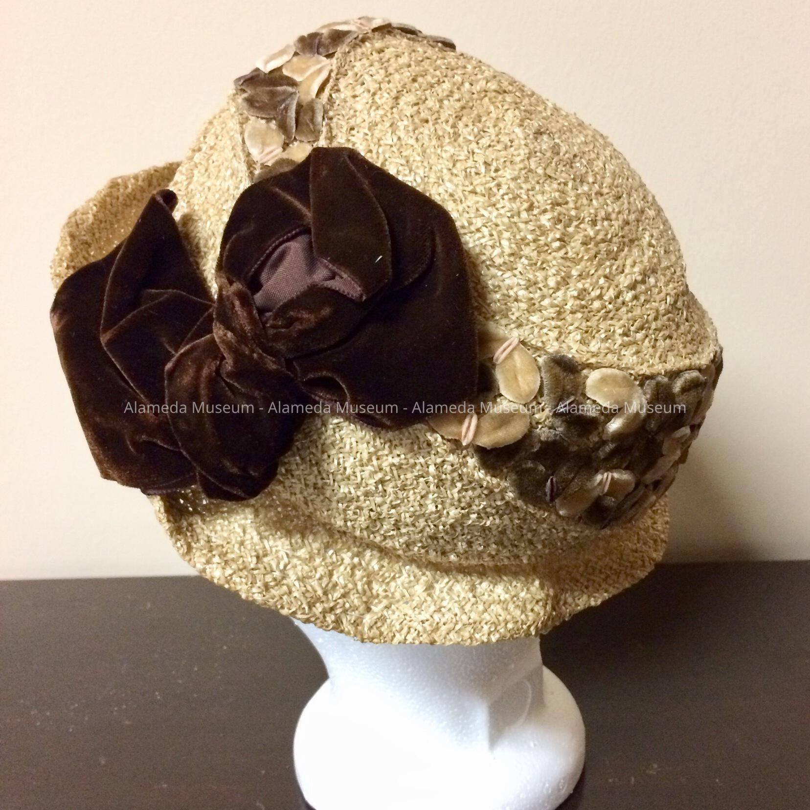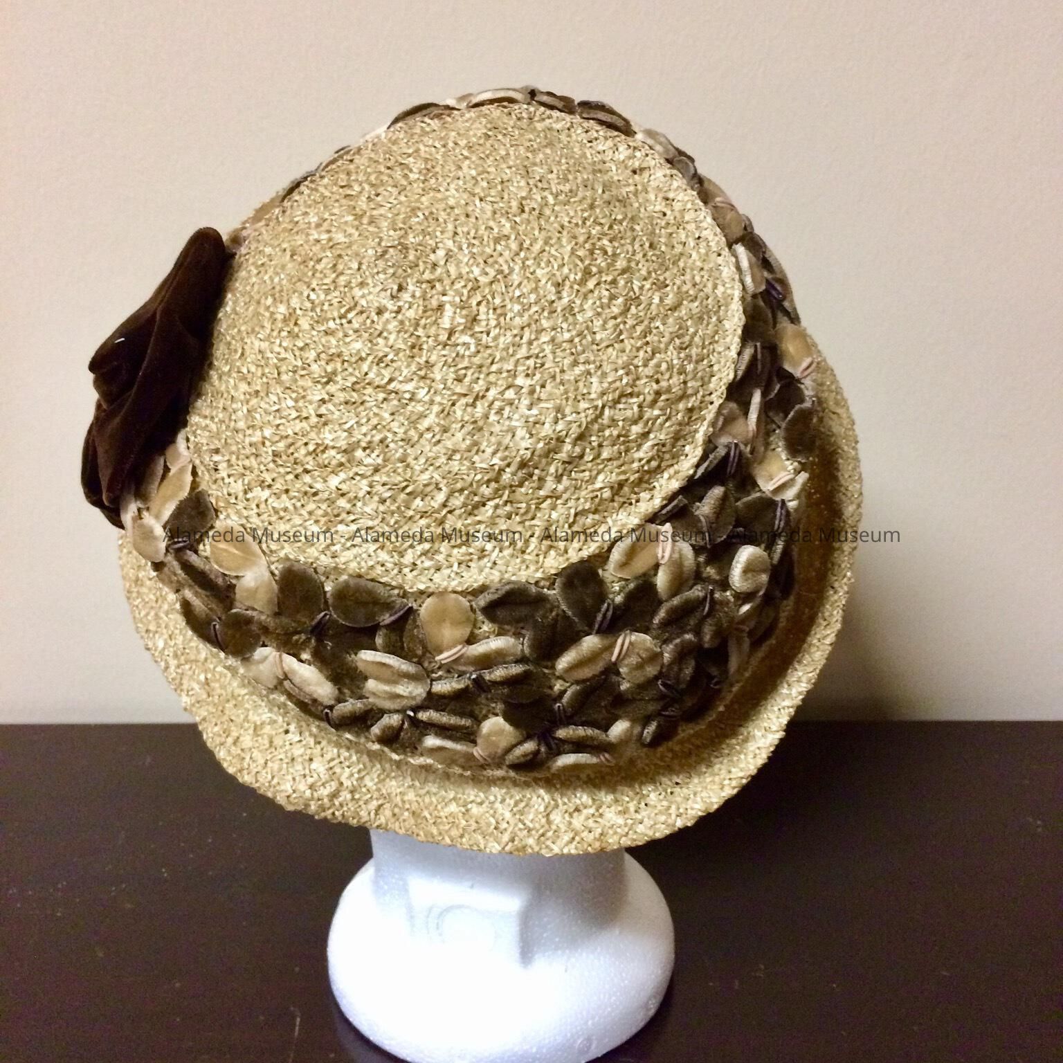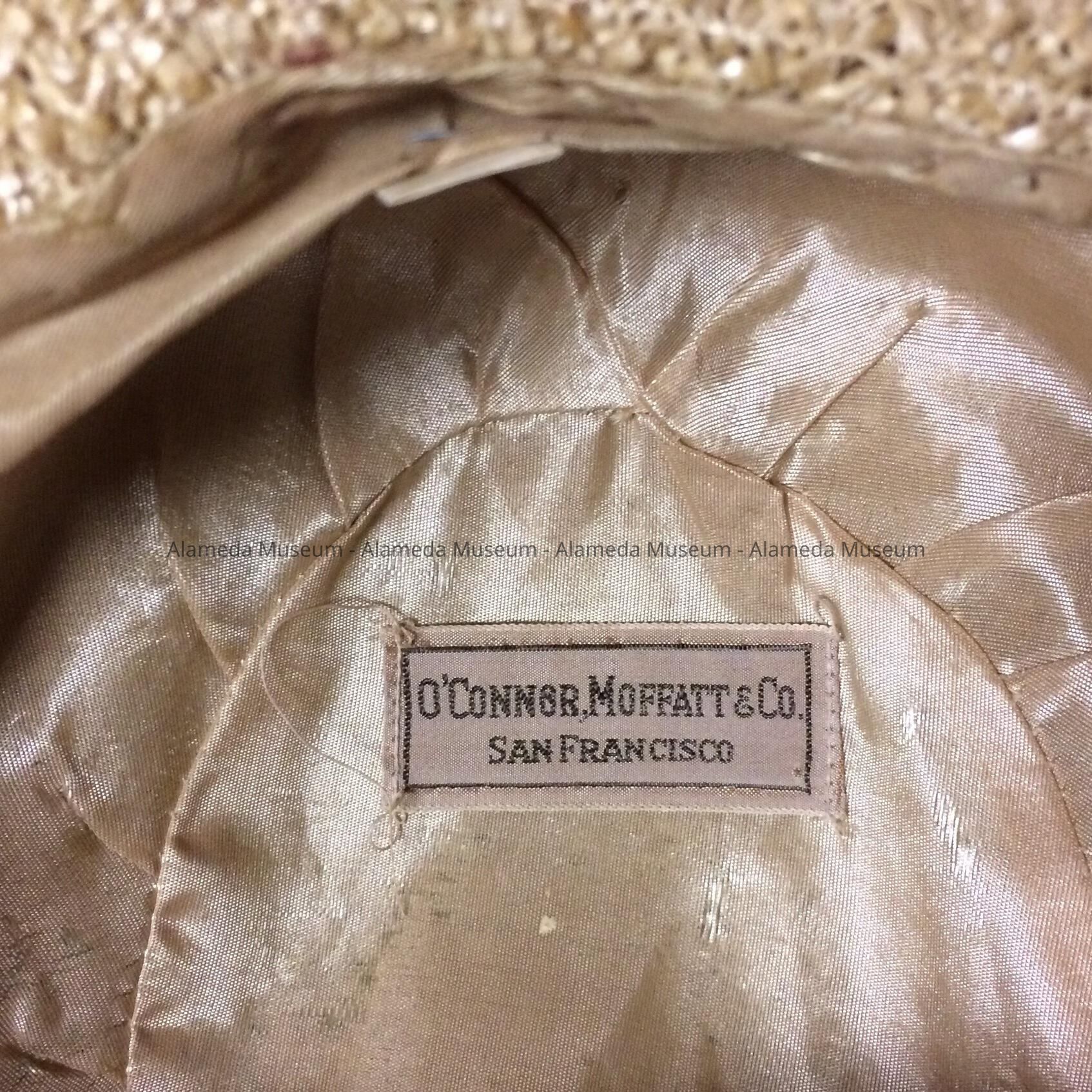 Description: Natural colored straw hat trimmed with tan & brown colored stylized leaves and dark brown colored bow. Upturned brim. Original interior label stating "O'Connor, Moffatt, Co., S.F.