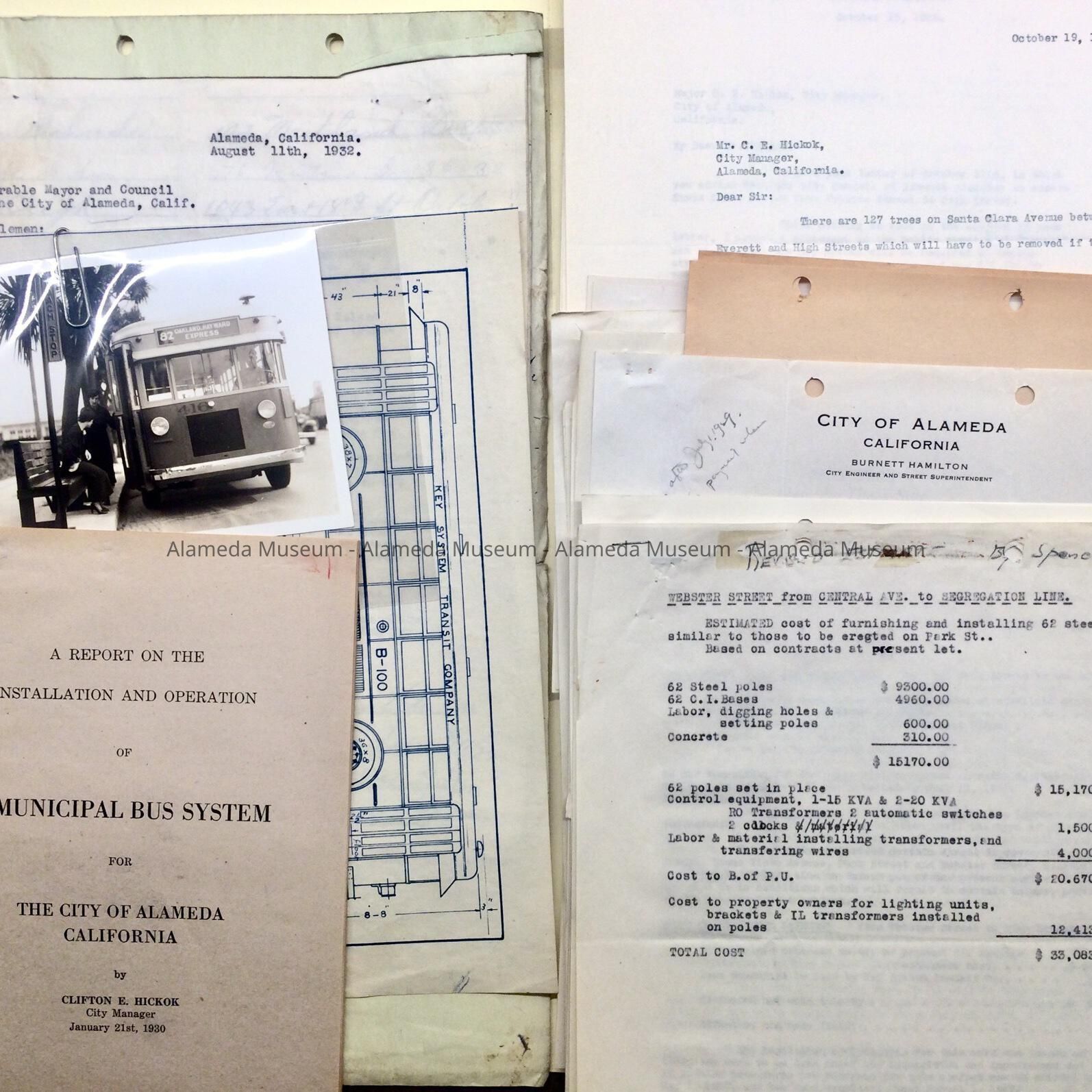 History of Object: Documents found in the attic of City Hall, in a folder (discarded in 2011) with tab legend: ‘Street Dept. - Paving 1928-1930’. Documents pertain to improvements started by City Manager Hickok, and City Engineer Burnett Hamilton, of Santa Clara, Buena Vista, Webster, and Park Street, including changes to the wiring and removal of trees and railroad tracks. Reflects the end of service of the Postal Telegraph Company (letter of March 5, 1929). Includes pages from Western Construction News about the work. Folder further includes papers about a proposed Municipal bus service, and a petition for continued service to Bay Farm Island.